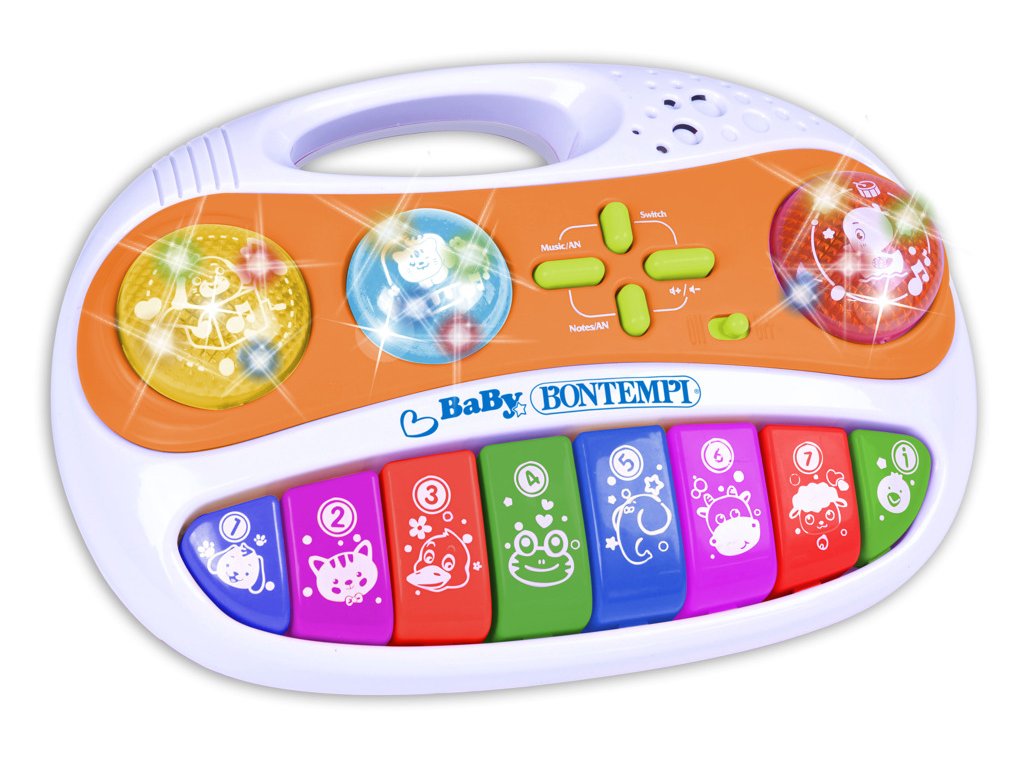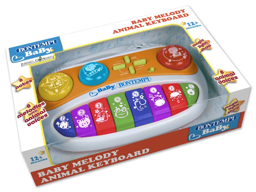 Baby Melody box s 8 klávesami – 8 dětských kláves, 8 melodických not, 8 hlasů zvířátek, 8 melodii, které mohou být vybrány s hudbou nebo bez, 8 melodií s pejskem,kočičkou a kačenkou, nastavitelná hlasitost, světelné efekty, automatické vypínání.