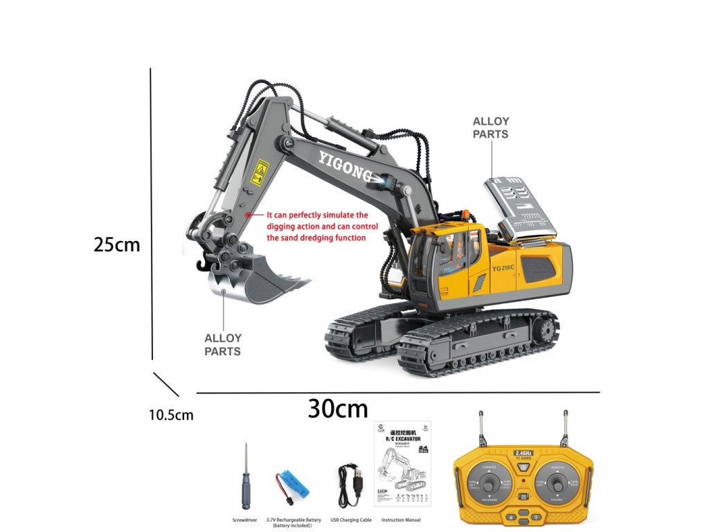 RC bagr je ideální volba pro fanoušky dálkově ovládaných stavebních strojů, kteří chtějí zažít realističtější práci na staveništi. Tento model umožňuje pohyb ve všech směrech – dopředu, dozadu, doleva i doprava, a navíc nabízí funkci bagrování. Ramenem lze bagrovat a tlačit materiál zpět, což zajišťuje skvělou interaktivní zábavu. Bagr se otáčí o 680° a je vybaven zvukovými a světelnými efekty pro ještě věrnější zážitek.