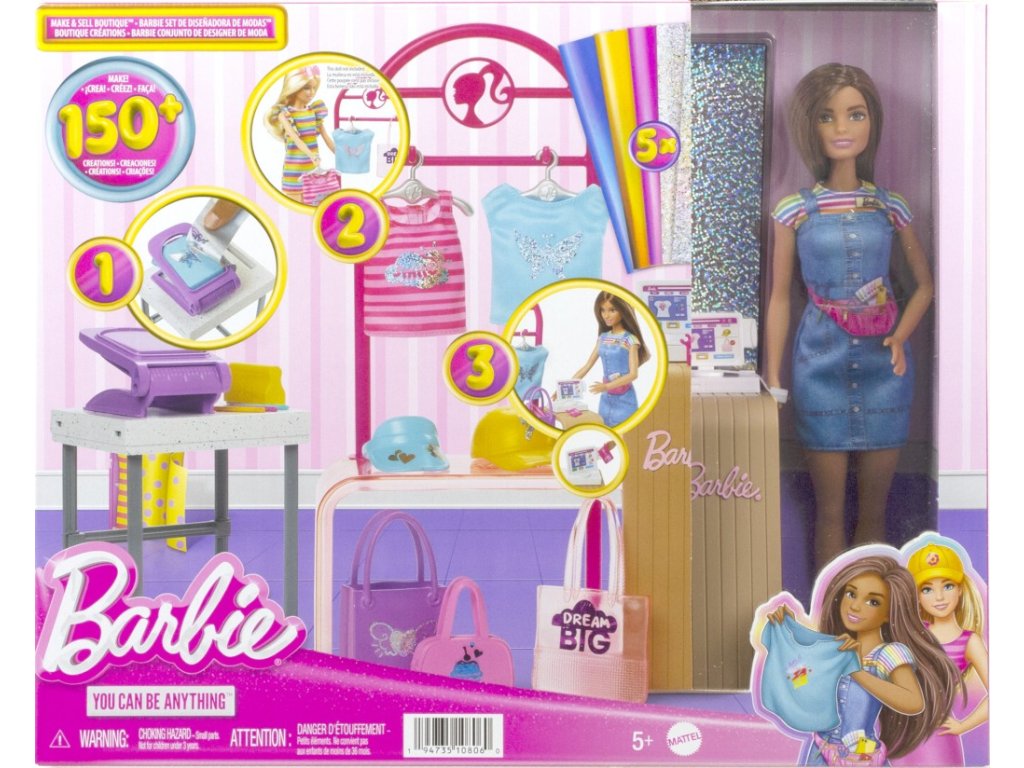 Herní set Barbie® Módní design studio s panenkou umožňuje dětem otevřít si vlastní butik s oblečky a nabízí tři způsoby hry: navrhování oblečků, vyrábění a prodej. Malí módní návrháři mohou vytvářet jedinečné oblečky pomocí funkce sítotisku na fólii a zdobit je opakovatelně použitelnými samolepkami pro více než 150 různých vzhledů. Stojánek na oblečky s ramínky je ideální na zavěšení vytvořených oblečků, jejich vystavení a zabalení k prodeji. Více než 20 tematických doplňků přispívá ke kreativní hře a vyprávění příběhů. Panenka neumí samostatně stát. Barvy a vzhled výrobku se mohou lišit.