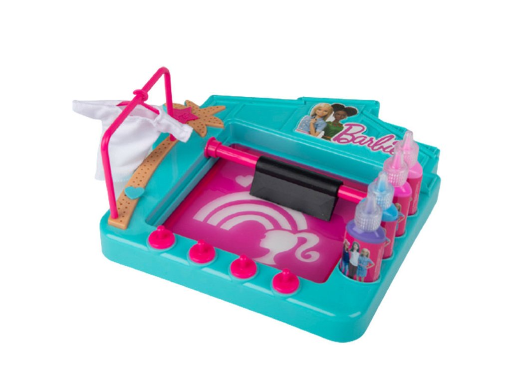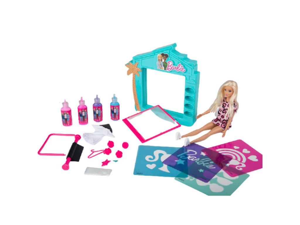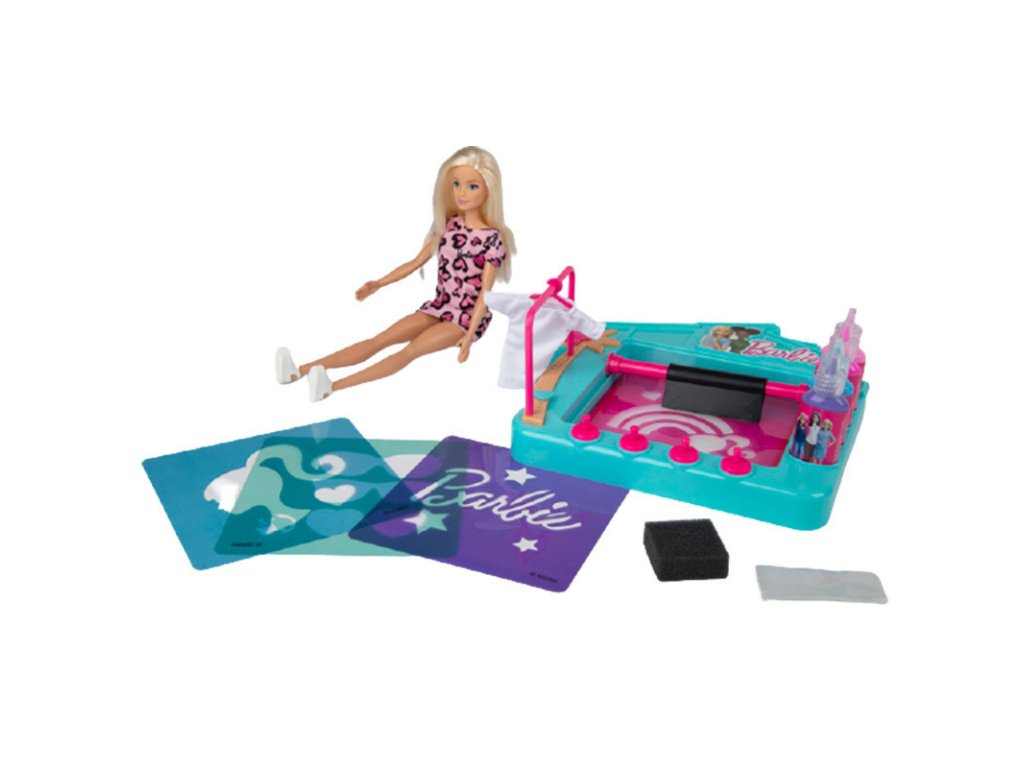 Vytvořte si svůj vlastní design na tričku Barbie s Barbie Fashion Studio. Před výběrem požadované barvy si vyberte design, který chcete mít na tričku, a umístěte jej na šablonu. Zatlačte na posuvnou lištu a stáhněte ji dolů po šabloně. Použijte různé vzory a razítka k vytvoření vlastního oblečení. Balení obsahuje: tiskařské studio s korkovou deskou, odnímatelná posuvná lišta, síťovaná deska, razítka, stojan s věšákem, Barbie tričko, šablona, 4 různé barvy na látku, houbička na mytí, rukavice a panenka Barbie.