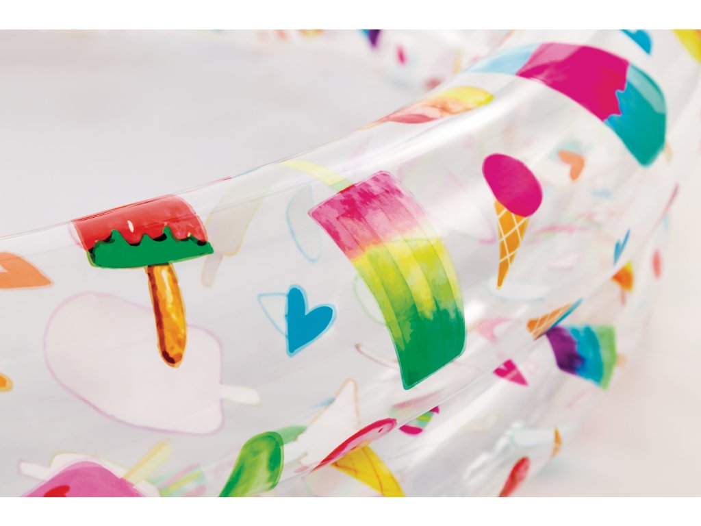 Krásný průhledný bazén s hvězdičkami, dvěma bočními pruhy, kapacitou 150 L. Opravná sada je součástí balení.