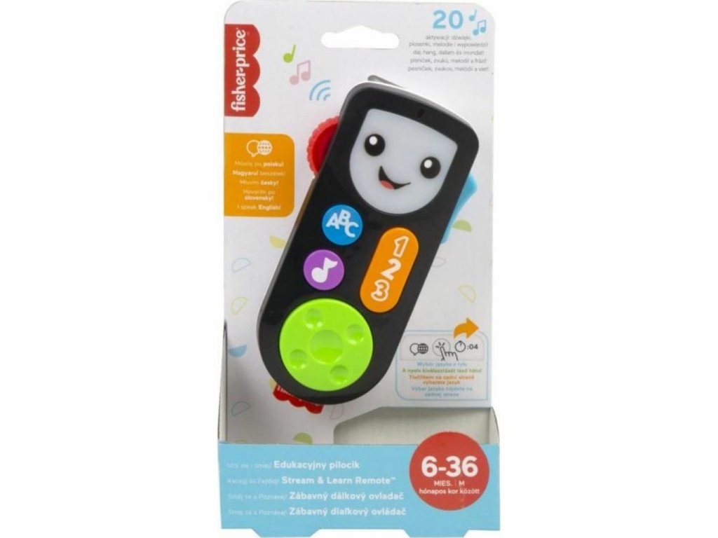 Směj se a Poznávej!® Výukový ovladač od Fisher-Price® naladí vaše dítě na čerstvou vzdělávací zábavu. Tato hračka ve tvaru dálkového ovládání vypadá jako skutečný ovladač, ale je tak akorát velká, aby ji mohly malé ručičky uchopit a přepínat, klikat a mačkat. Když vaše dítě stiskne tlačítka ABC, 123 nebo hudba, rozsvítí se přátelská obrazovka a spustí se více než 20 písniček, zvuků a frází o abecedě, počítání a barvách. Další zábavné činnosti, jako je přepínač, číselník a tlačítka s šipkami, pomáhají posílit jemné motorické dovednosti dítěte (a navíc jsou zábavné)! Pro výběr jazyka opakovaně stiskněte tlačítko s označením zeměkoule, držte 4s a zvolte jazyk.