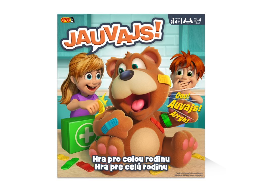 Balení hry je barevné a přitažlivé, s ilustracemi dvou dětí, které si hru užívají, a nápisem „Hra pro celou rodinu“. Součástí balení je kromě figurky medvěda také 12 náplastí různých barev a jednoduchý návod k použití. Pro chod herního mechanismu jsou potřeba tři AAA baterie, které nejsou součástí balení. Hra JAUVAJS! je ideální volbou pro rodinné hraní i pro zábavu s přáteli, přičemž kombinuje interaktivní prvky s veselým a snadno pochopitelným konceptem.
