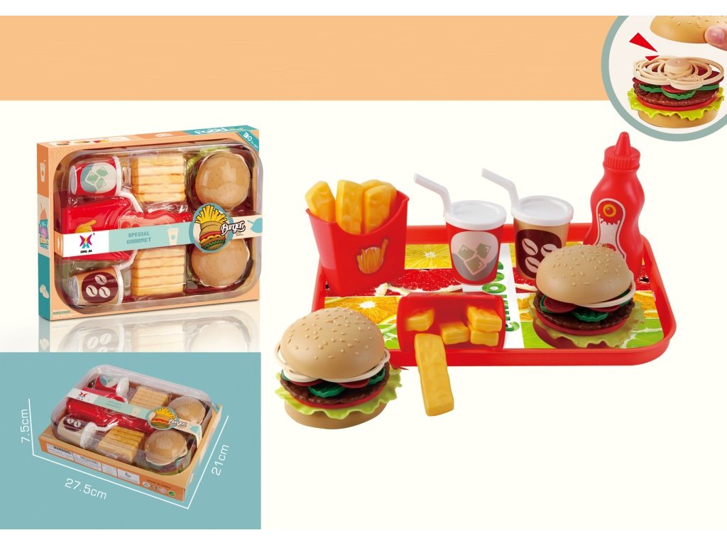 Tento hrací set je ideální pro všechny malé kuchaře a restauratérské nadšence! Set obsahuje plastové hranolky, tác, hamburger a další doplňky, které umožňují vytvářet vlastní oblíbené jídlo. Děti si mohou zahrát na přípravu fast foodu a servírování jídla, což podporuje jejich kreativitu a rozvoj sociálních dovedností.