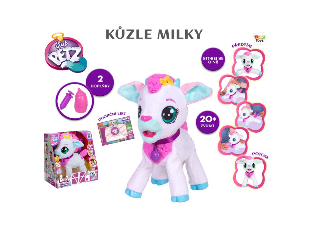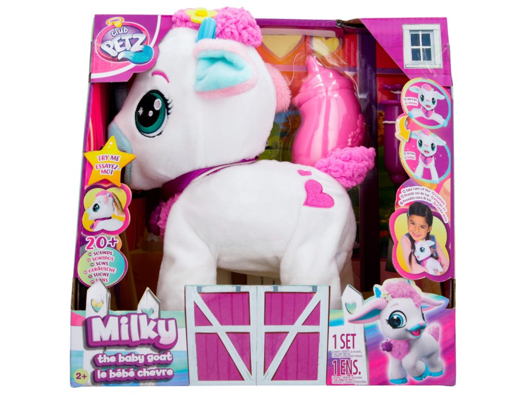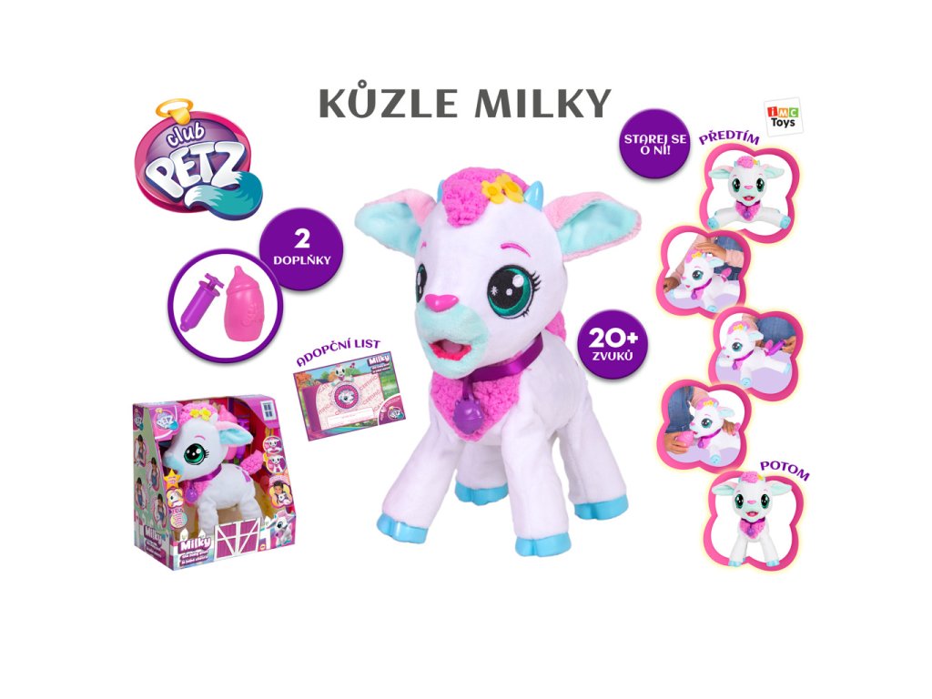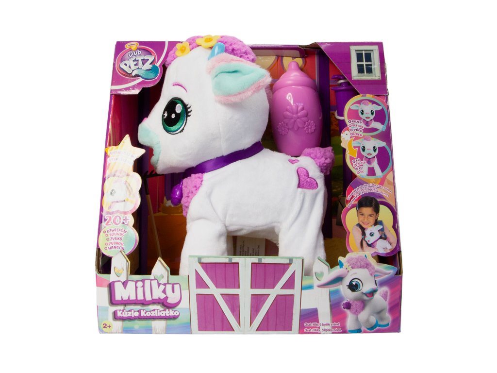 Interaktivní kůzlátko Milky, Milky vydává až 20 různých zvuků. Hezky se o ní postarej, hlaď ji po hlavě, naočkuj ji, nakrm ji. Ona se postvaví na všechny čtyři. Balení obsahuje: 1 plyšáka, 1 lahvičku, 1 injekci, 1 letáček, 1 návod. Výrobek vyžaduje 3 AG13 baterie, které jsou součástí výrobku. Výrobek je vhodný pro děti od 2 let.