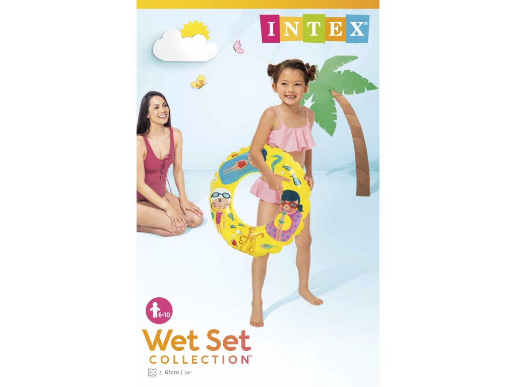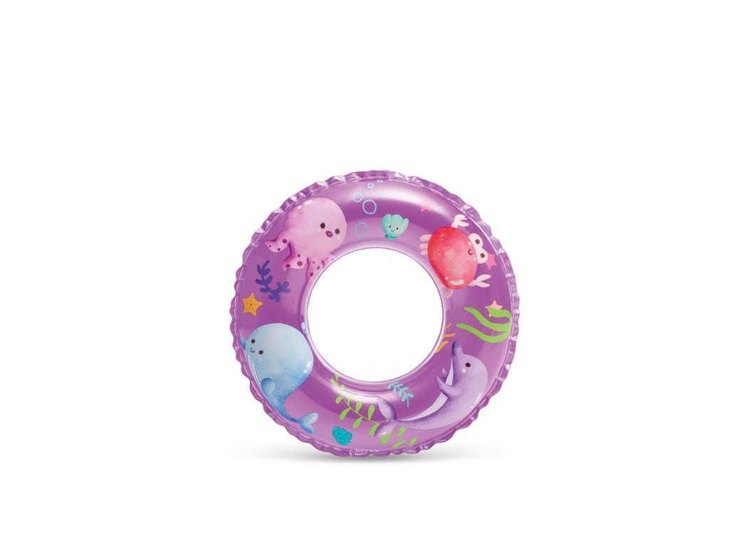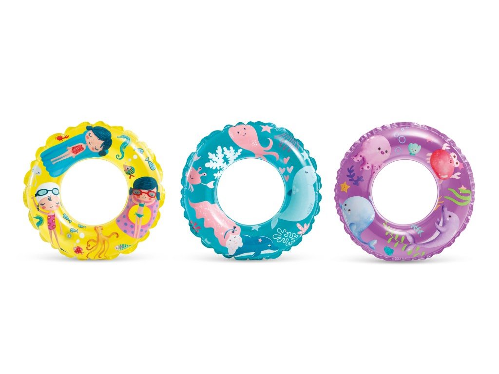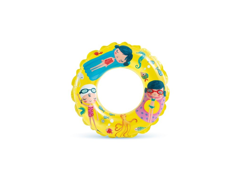 Plovací kruh s veselými motivy zvířátek, holčiček a podmořského světa je vyroben z masivního průhledného vinylu.