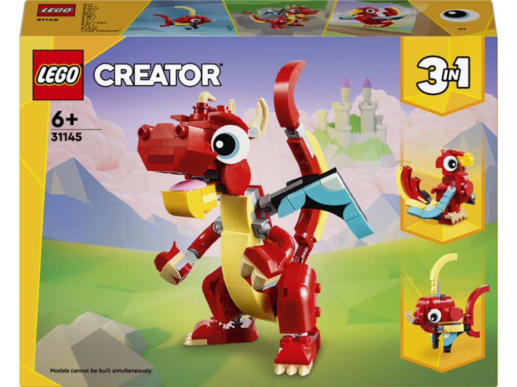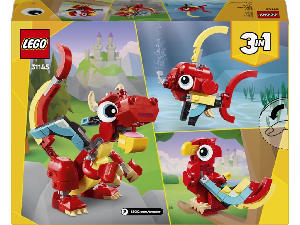 • 3 kouzelná zvířata v jedné stavebnici – Děti od 6 let se se stavebnicí LEGO® Creator 3 v 1 Červený drak ponoří do stavění a přestavování 3 pestrobarevných modelů z jedné sady kostek• Nekonečné herní možnosti – Malí stavitelé si vychutnají zábavné příběhy se 3 různými modely zvířat: Proletí se s drakem, vydají se na dobrodružství ve vzduchu s fénixem a zaplavou si s rybkou• Pohyblivé figurky zvířat – Každý model má pohyblivé části těla: Drak dokáže hýbat pažemi, tlapkami, křídly, nohama, chodidly a tlamou, fénix hýbá křídly a rybka může pohybovat ploutvemi• Výstavní modely – Každý ze 3 modelů zvířat LEGO® si děti po hraní mohou vystavit v pokojíčku• Nápad na dárek pro děti – Tato hračka 3 v 1 přináší skvělý stavitelský a herní zážitek pro malé stavitele a představuje skvělý dárek k příležitosti čínského nového roku• 3 porce zábavy v 1 – Užijte si ještě více zábavy s dalšími stavebnicemi z řady LEGO® Creator 3 v 1 (prodávají se samostatně) s úžasnými zvířaty, skvělými vozidly a propracovanými městskými scénami • Hračky LEGO® Creator 3 v 1 – S každou ze stavebnic 3 v 1 si děti postaví 3 různé modely inspirované jejich zájmy, včetně zvířat, vozidel a propracovaných městských scén• Stavějte a hrajte si – Tato stavebnice LEGO® se skládá ze 149 dílků a součástí je model draka, který měří přes 12 cm na výšku