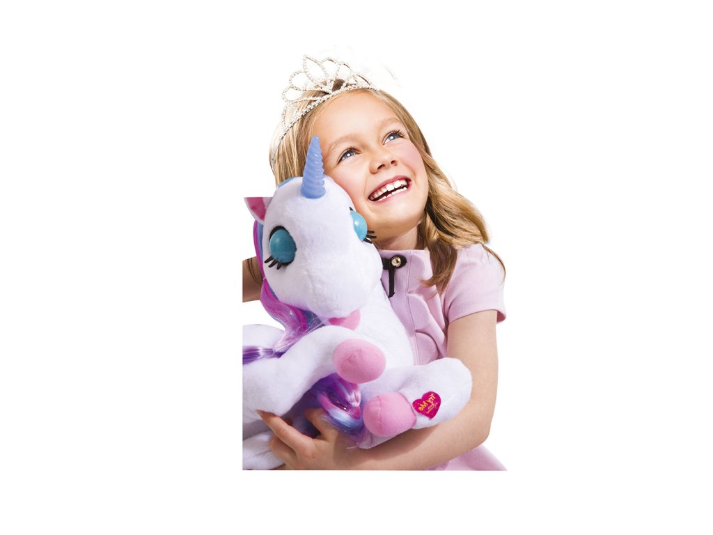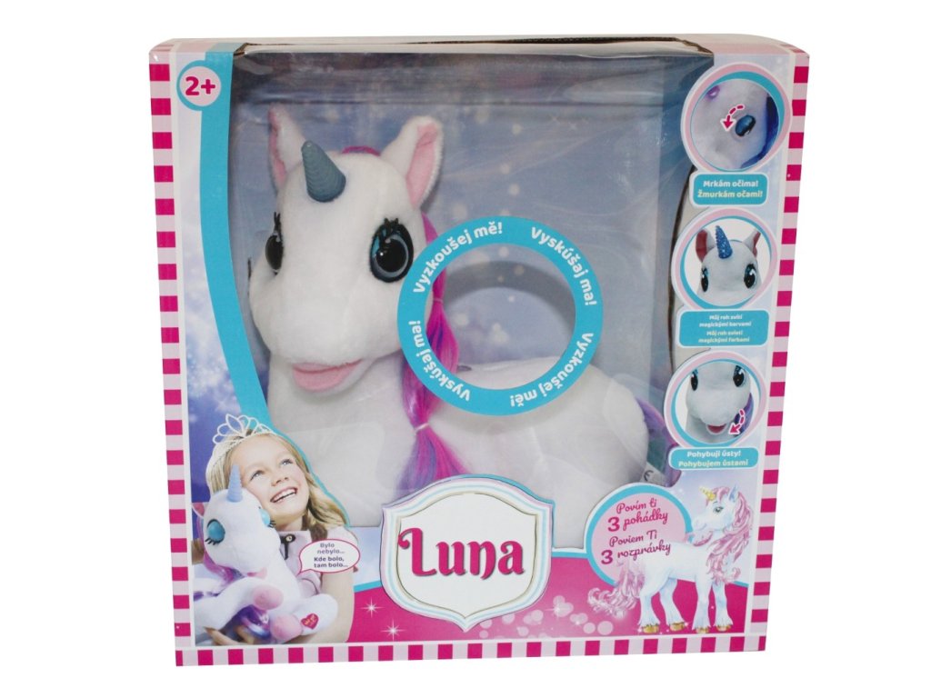 Luna ti poví 3 pohádky (Popelka, Zlatovláska a tři medvědi, Na vlásku). Luna mrká očima a její roh svítí magickými barvami. Velikost 36cm.