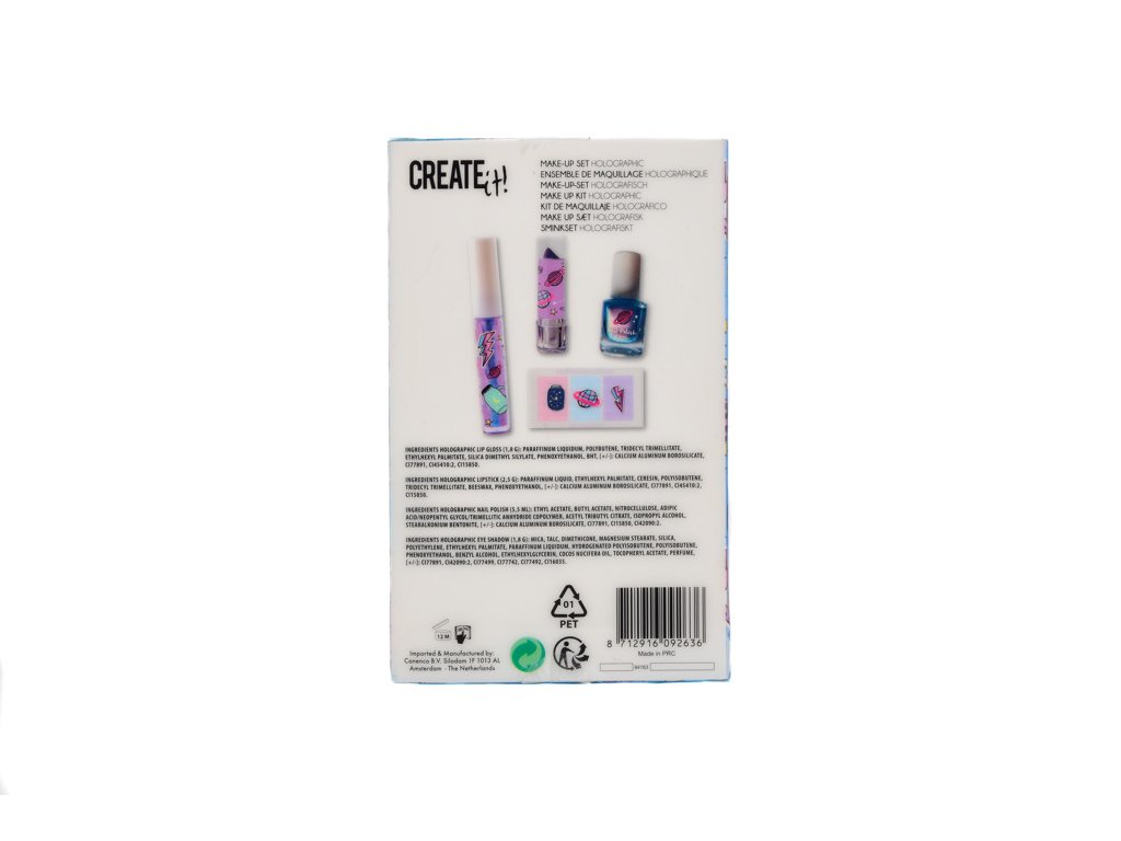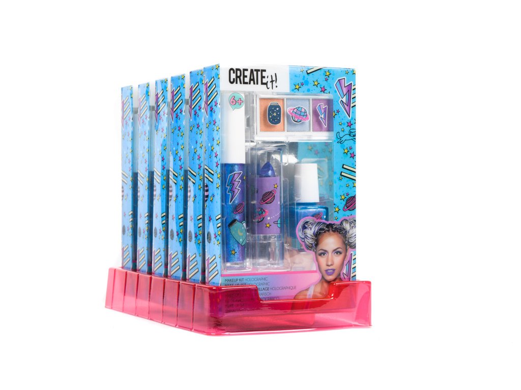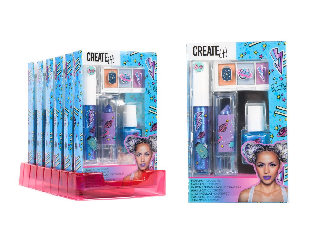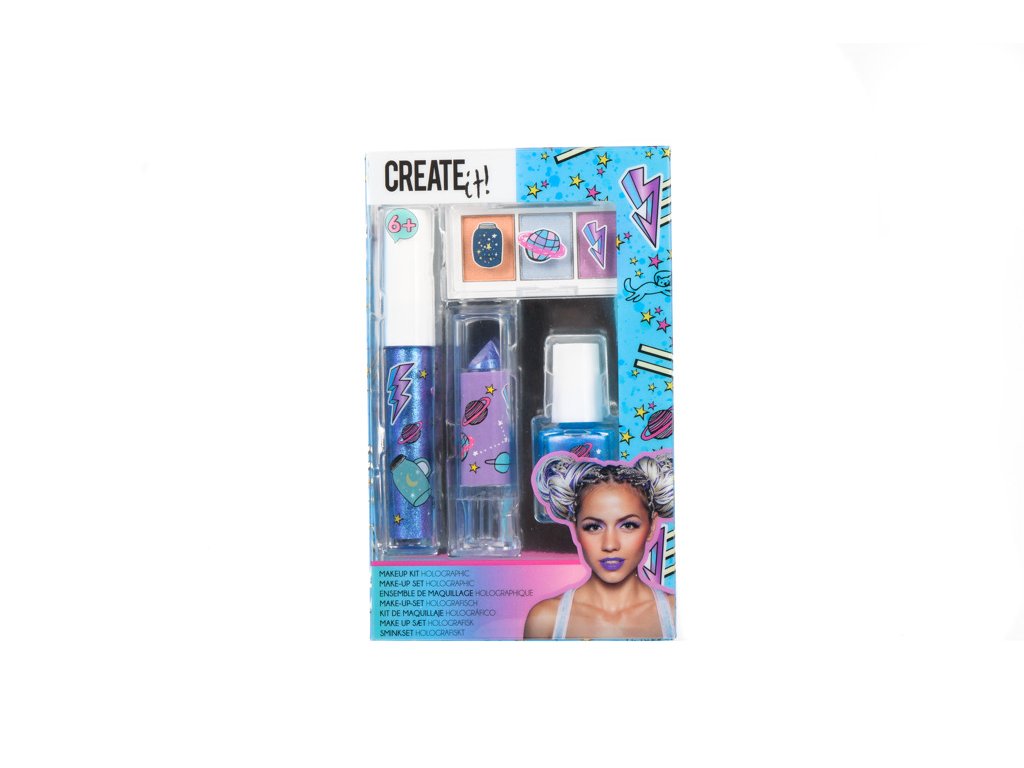 Make up sada holografická obsahuje oční stíny, lesk na rty, rtěnku a lak na nehty – vše v holografických barvách.