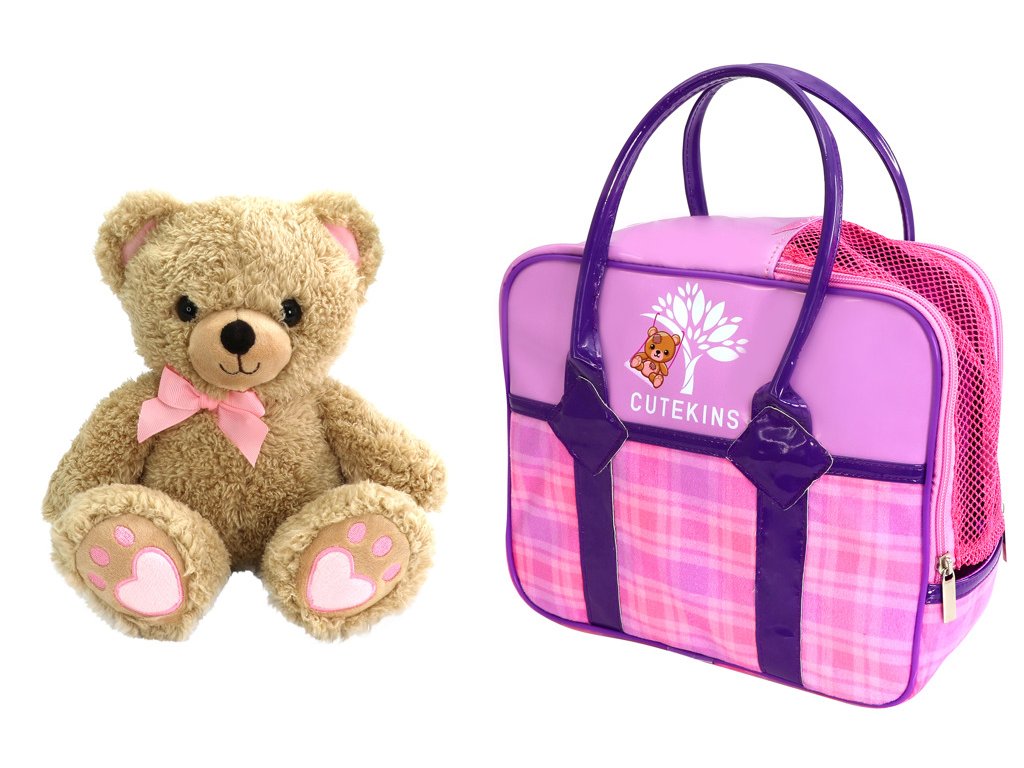 Plyšový medvídek s módní kabelkou. Medvídka můžeš pohodlně nosit v kabelce. Výrobek je vhodný pro děti od 2 let.