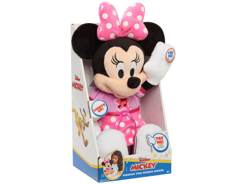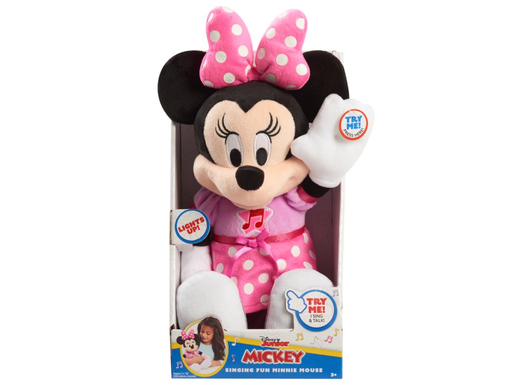 Zábavný plyšák Minnie Mouse umožní dětem zpívat spolu s myškou Minnie celé hodiny! Stiskněte Minnie Mouse ruku a zazpívejte si s ní píseň z Minnie's Bow-Toons! Minnie Mouse je vysoká 30 cm, má na sobě rozkošný růžový outfit! Tento plyšový zábavný kamarád je vyroben z měkkých materiálů a je ideální pro každého fanouška myšky Minnie. Malí fanoušci budou rádi, když si s sebou plyšový plyšák Minnie Mouse vezmou, ať jdou kamkoli! Vyžaduje 2 x AA baterie (součástí balení). Věk 3+