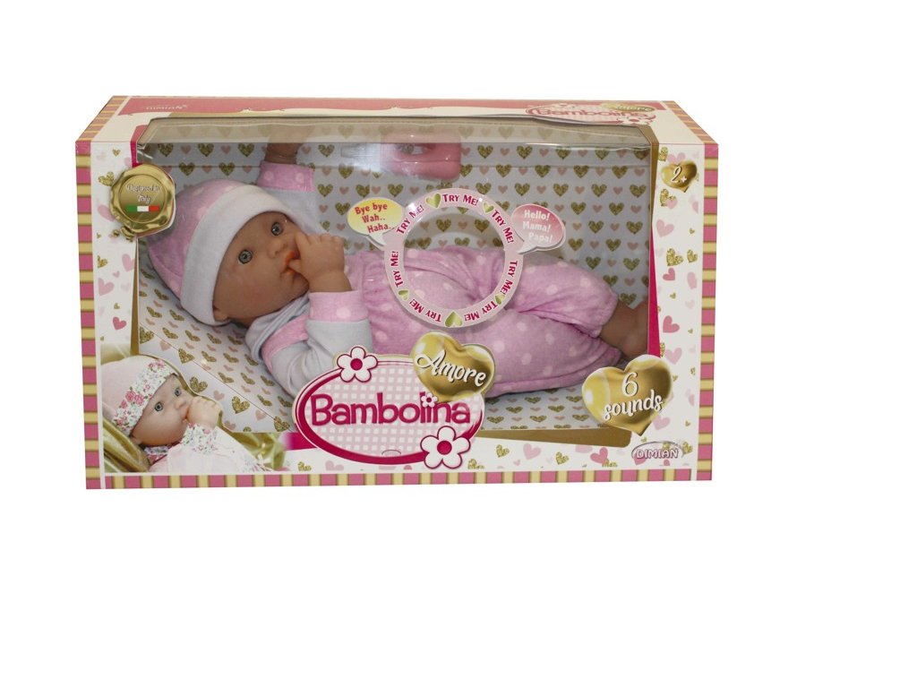 Miminko Bambolina Amore o velikosti 36 cm je krásná interaktivní panenka, ideální pro děti od 2 let, které si chtějí hrát na maminku a pečovat o své miminko. Panenka má měkké tělíčko, které je příjemné na dotek, a hlavička, ručičky a nožičky jsou vyrobeny z kvalitního vinylu, což jí dodává realistický vzhled. Miminko vydává 4 melodie a různé dětské zvuky, které přidávají na interaktivitě a zpříjemňují hru. Výrobek vyžaduje 3× LR44 baterie (baterie nelze vyměnit). Součástí balení je lahvička, se kterou si mohou děti hrát při krmení. Bambolina Amore je skvělý společník pro rozvoj představivosti, jemné motoriky a péče o panenku.