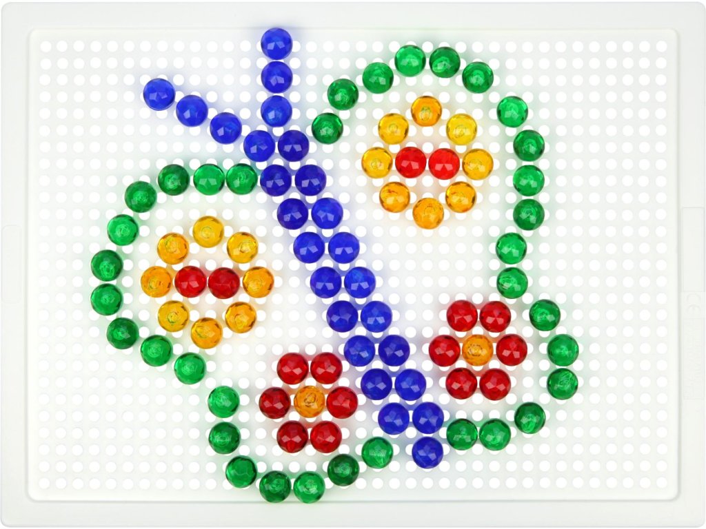 Skládejte barevné kloboučky na podkladovou desku. Balení obsahuje 140 ks kloboučků a pytlíček na uložení. Předlohu najdete na zadní straně krabice.