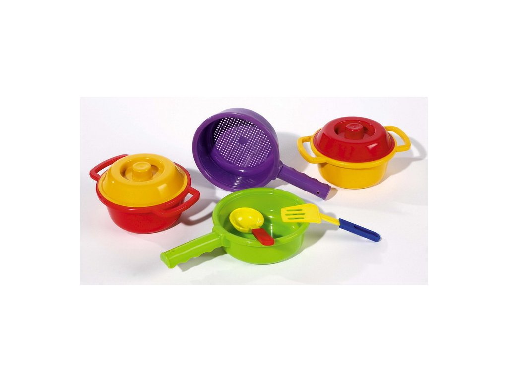 Sada nádobí do kuchyňky – obsahuje síto, dva kastůlky s pokličkou, pánvičku, obracečku a naběračku.