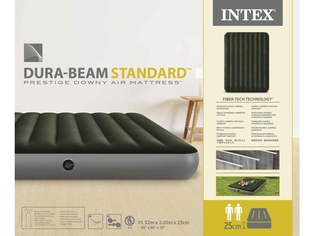 Nafukovací postel o velikosti 1,52 cm x 2,03 m x 25 cm. Maximální nosnost 272 kg. Čas nafouknutí je 4 minuty.