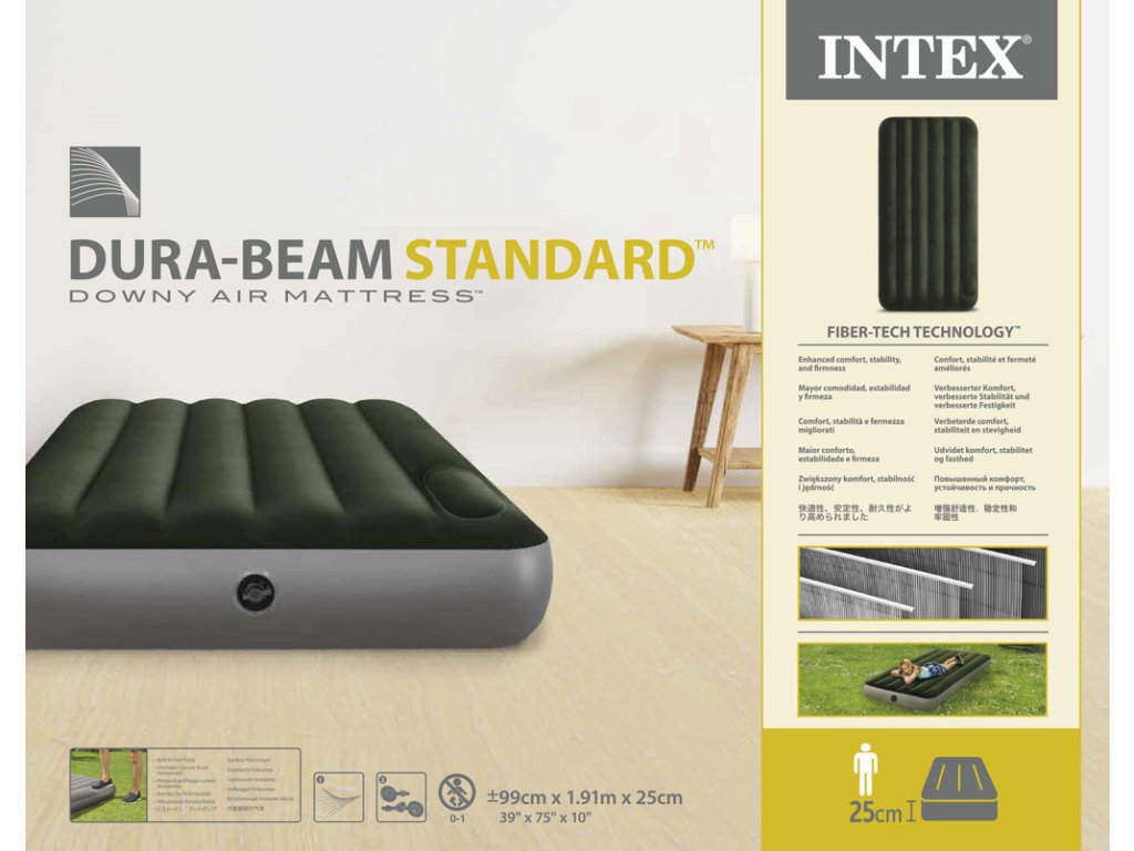 Nafukovací postel o velikosti 99 cm x 1,91 m x 25 cm. Maximální nosnost 136 kg. Čas nafouknutí je 2,5 minuty.