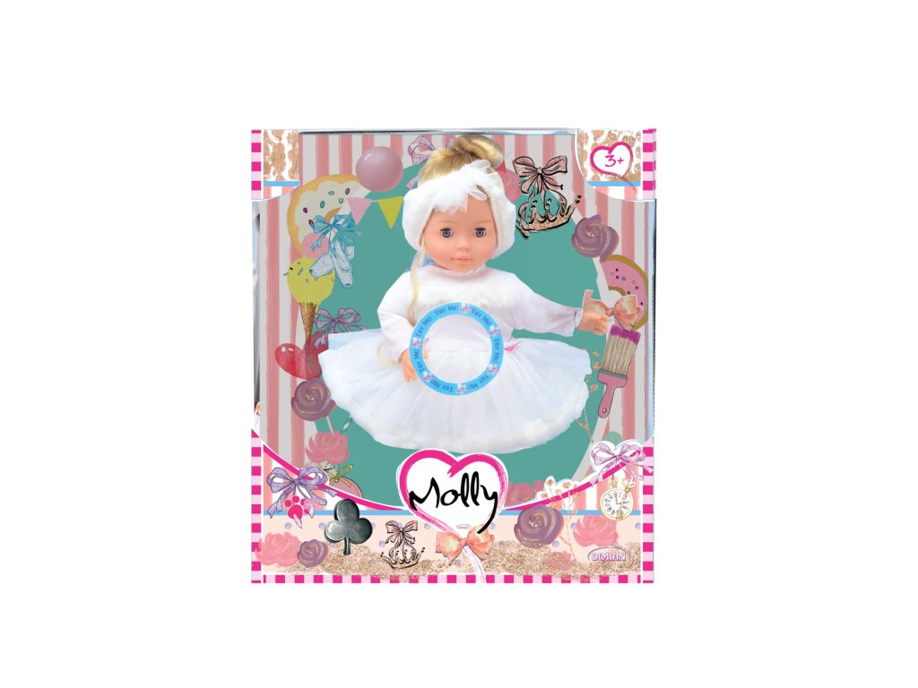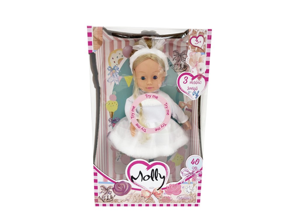 Panenka Molly je 40 cm velká, má vinylovou hlavičku, ruce a nohy. Molly má na sobě krásné baletní šatičky, mrkací oči a krásné, dlouhé vlásky. Umí přehrávat 3 písničky. Panenka je vhodná pro děti od 3 let a vyžaduje 3× LR44 baterie, které jsou součástí balení.