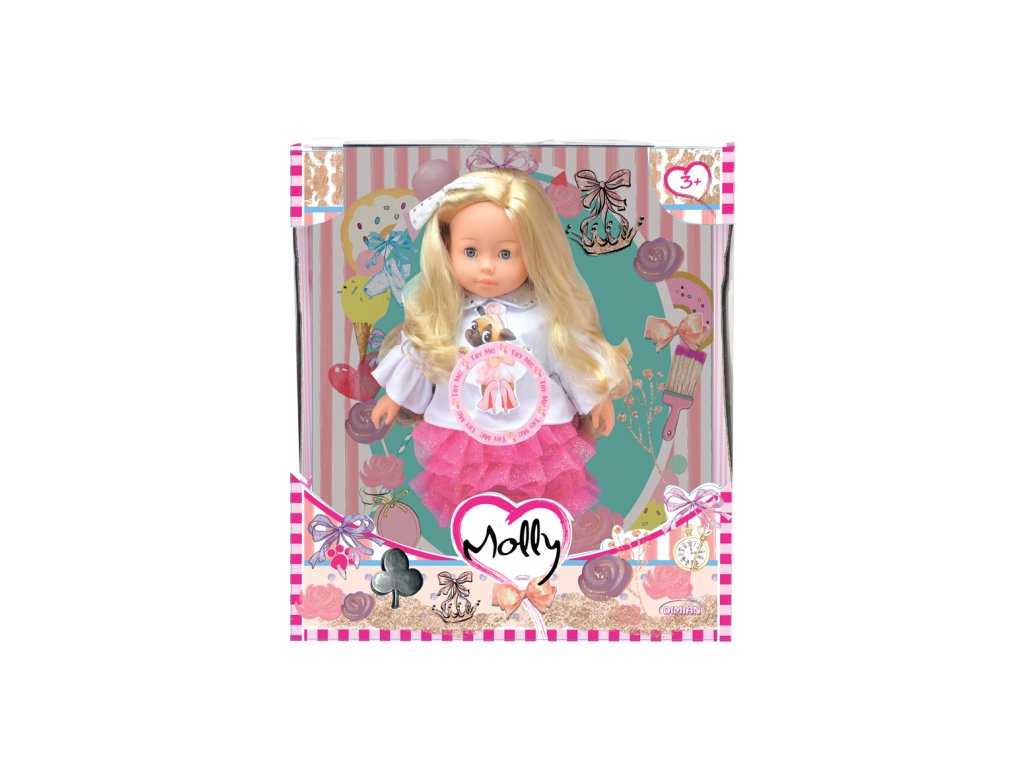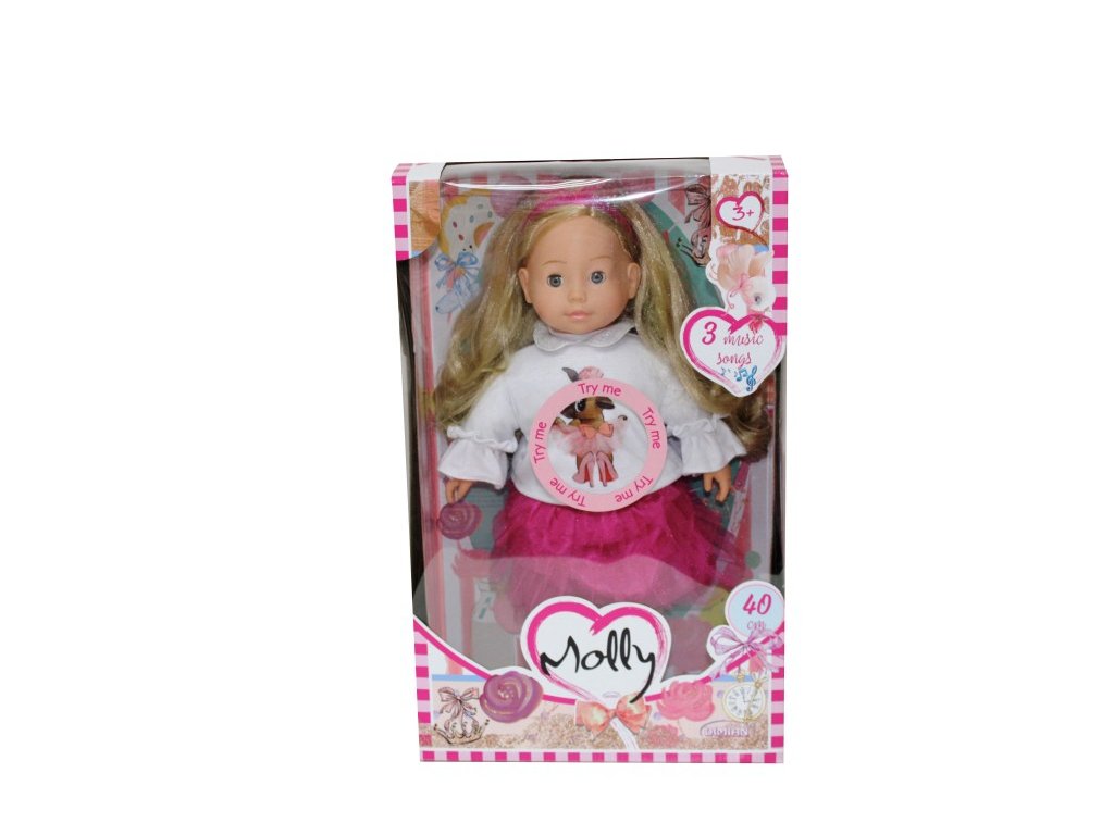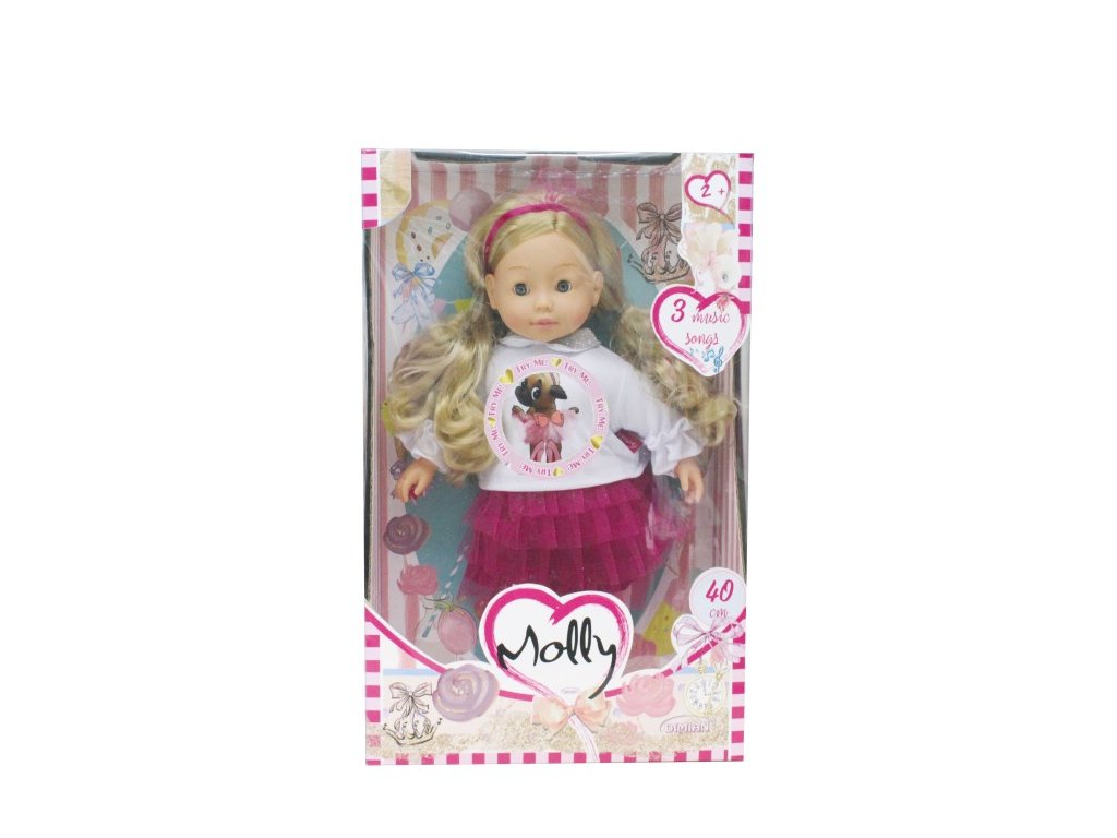 Panenka Molly je krásná 40 cm velká panenka, která je ideální pro děti od 3 let. Má realistickou vinylovou hlavičku, ruce a nohy, což jí dodává autentický vzhled. Molly má mrkací oči a dlouhé, nádherné vlásky, které si děti mohou česat a upravovat. Panenka umí přehrávat 3 písničky, které zpříjemní hru a přinesou radost při každém hraní. Pro funkci panenky jsou potřeba 3× LR44 baterie, které nejsou součástí balení. Panenka Molly je perfektní společník pro kreativní hru a rozvoj jemné motoriky.