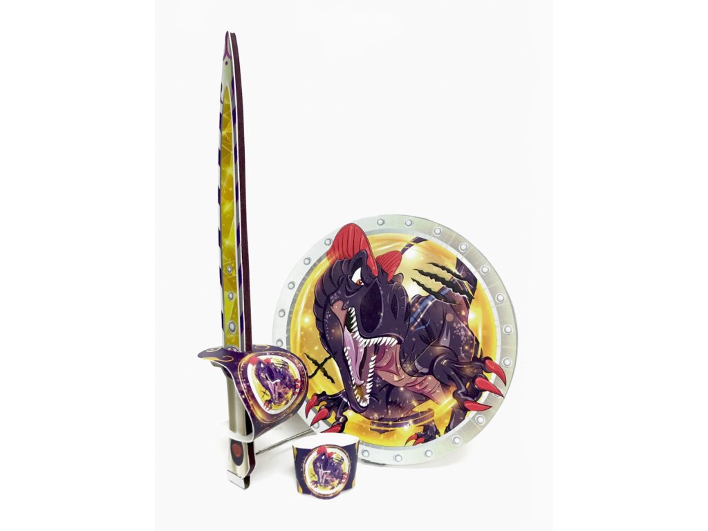 „Dětský pěnový meč a štít s motivem D-Rexe pro malého samuraje. Souprava je vyrobena z pěny a je velmi bezpečná. Vhodné jako doplněk ke karnevalovému kostýmu.“