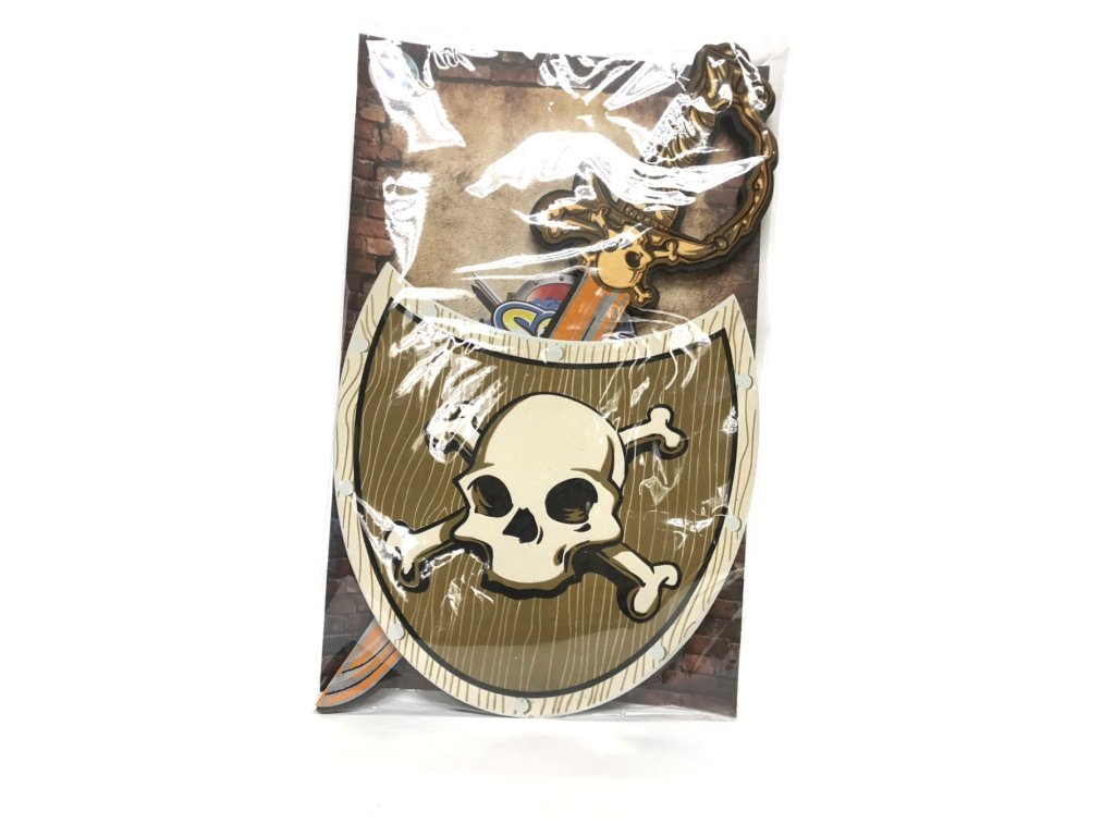 „Dětský pěnový meč a štít s motivem piráta pro malého samuraje. Souprava je vyrobena z pěny a je velmi bezpečná. Vhodné jako doplněk ke karnevalovému kostýmu.“