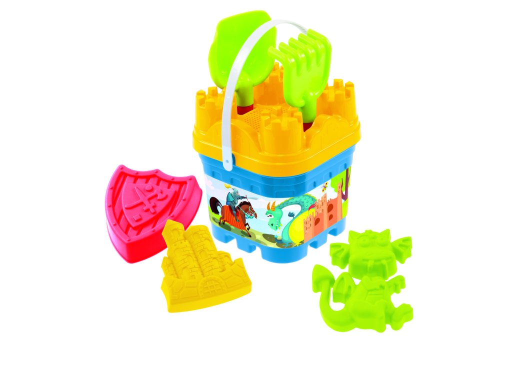 Písková sada Hrad IML. Sada obsahuje kyblík, hrabičky,lopatku, sítko, tři tématické bábovky. Vyrobeno v EU z kvalitního plastu.