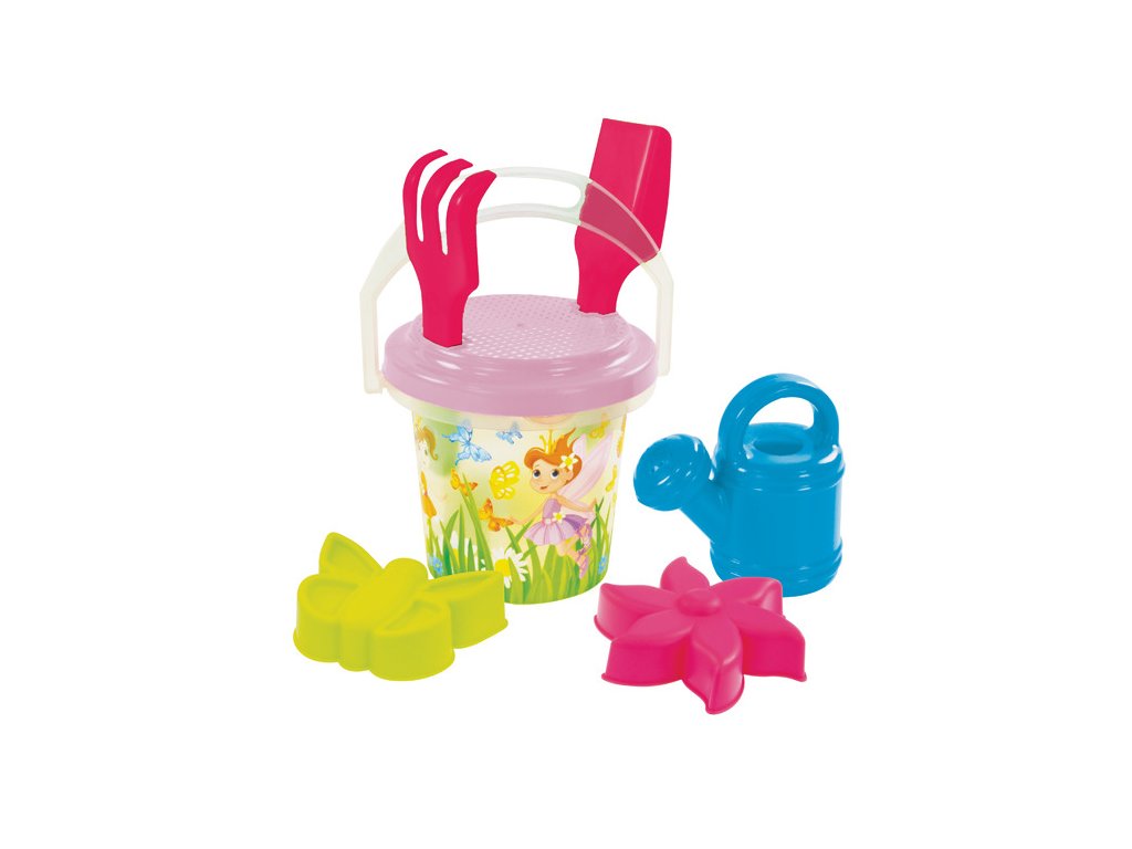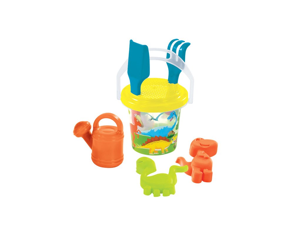 Písková sada transparentní ve třech designech – víly, dinosauří a rybičky. Sada obsahuje kyblík o velikosti 1,3l, hrabičky,lopatku, sítko, konvičku a dvě tématické bábovky. Vyrobeno v EU z kvalitního plastu.