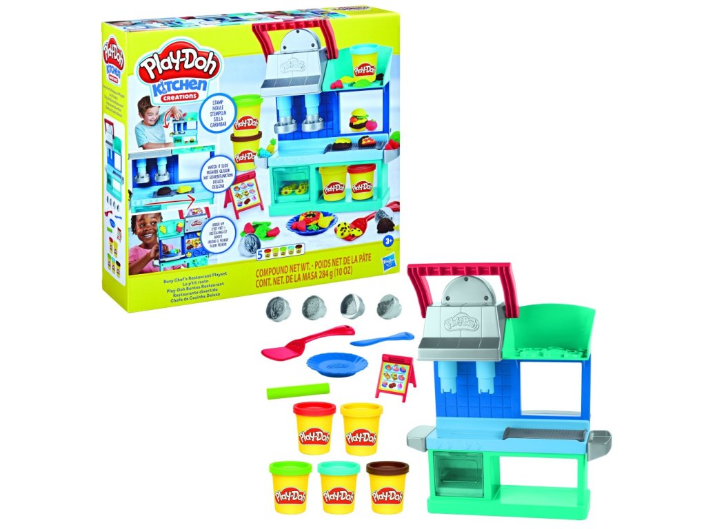 Díky herní sadě Play-Doh Restaurace zažijí malí šéfkuchaři, jaké je to vést vlastní vyhlášenou restauraci. Přitom budou vytvářet a upravovat úžasné lahůdky, které pak nabídnou svým pomyslným zákazníkům. Děti mohou pomocí razítek vyrobit pizzu, burger, těstoviny nebo kuře – stačí stisknout páčku a na světě jsou hned 2 jídla najednou! Navíc, jakmile se páčka uvolní, budou pak zaujatě sledovat, jak se pečící plech s hotovým jídlem sám posune k výdejnímu okénku. Spousta dalších formiček vás čeká jak nad výdejním okénkem, tak po celé druhé straně – je libo báječné hranolky, oblohy na burger, ztřeštěné sušenky, ovoce nebo jednu z dalších dobrot? Připravte své výtvory na talíř a podávejte je skrz okénko, aby přátelé viděli, že jejich objednávka už je hotová! Stojan s jídelním lístkem a další kuchyňské náčiní podpoří fantazii a zábavu při hraní. Tato hračka pro holky a kluky od 3 let je skvělým dárkem pro všechny malé kuchaře a kuchařinky, kteří si rádi hrají na vaření.