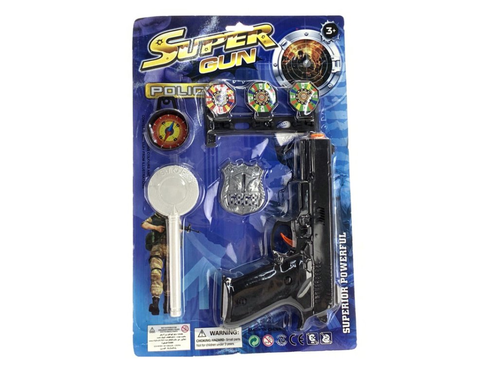Sada pro malé policisty. Součástí sady je pistole, odznak, plácačka, terčíky a buzola. Vhodné pro děti od 3 let.