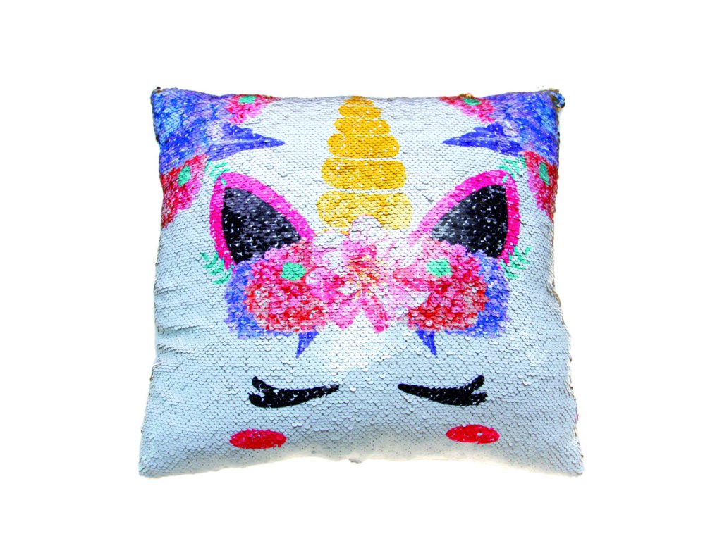 Plyšový polštář s flitry o velikosti 38 cm. Na polštáři je obrázek jednorožce. Vhodný pro děti od 3 let.