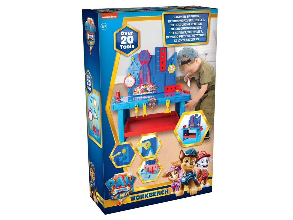 Pracovní stůl kutili Tlapková Patrola s 20 nástroji! Balení obsahuje – stůl s velkou pracovní ploucho a zády, šroubovák, kladívko, klíč, 2 válečky, 5 pastelek, 3 omalovánky, 10 šroubů, 2 ks dřeva a 5 samolepek. Rozměr stolu je 46×32×78 cm.