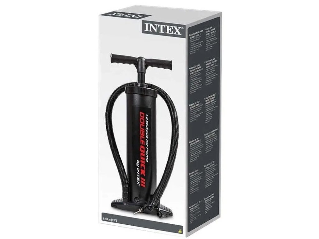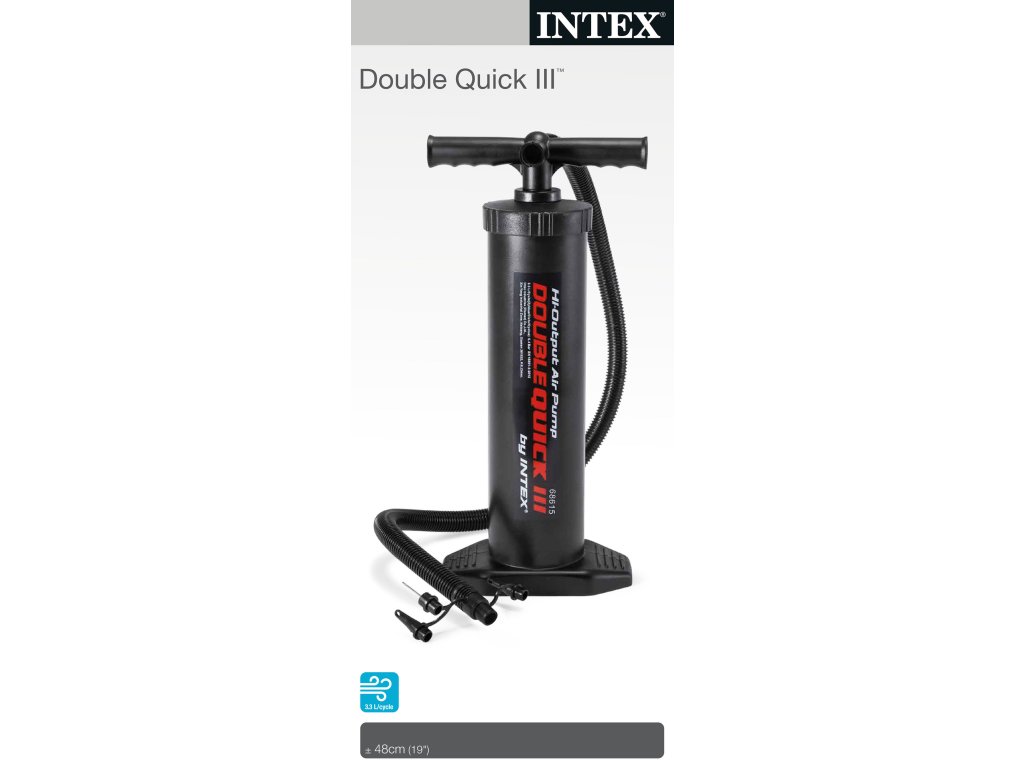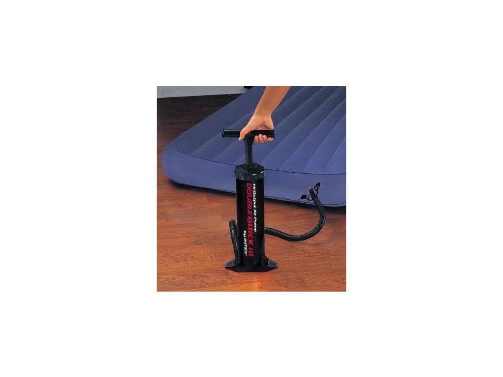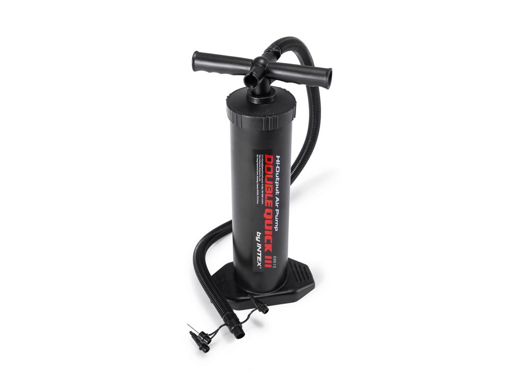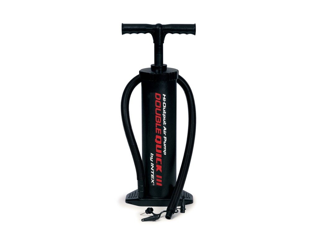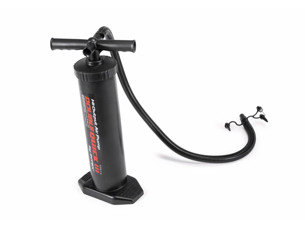 Ruční pumpa Velikost 48 cm. Dvojitý objem, dvojitý záběr, 3 1/2 krát průtok vzduchu. Pumpuje vzduch při tahu vzhůru i při pohybu dolů. Flexibilní hadička se 4 násadami je použitelná pro většinu ventilků. Z lehkého pevného plastu. Vysoko-objemová pumpa umožňuje nafukování i vyfukování.