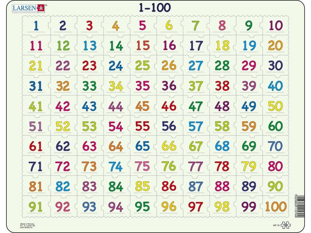 Puzzle Puzzle 1 – 100 se 100 dílky pro začátečníky. Výuková skládačka LARSEN poskytuje praktický trénink pro procvičování čísel. Úkolem dítěte je sestavení dílků s po sobě jdoucími čísly.