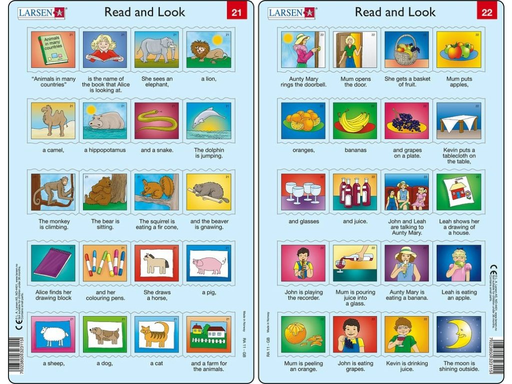 Puzzle Angličtina – delší věty RA11 20 dílků, každý s malým obrázkem. Pod každým dílkem se nachází text, který se vztahuje k příslušnému obrázku. Přečti text a najdi k tomu odpovídající obrázek. Každý dílek lze umístit pouze na přesně určené místo, což umožní dětem ověřit, zda správně spojily obrázek a text.