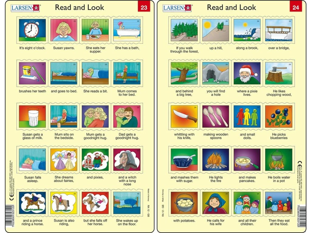 Puzzle Angličtina – delší věty RA12 20 dílků, každý s malým obrázkem. Pod každým dílkem se nachází text, který se vztahuje k příslušnému obrázku. Přečti text a najdi k tomu odpovídající obrázek. Každý dílek lze umístit pouze na přesně určené místo, což umožní dětem ověřit, zda správně spojily obrázek a text.