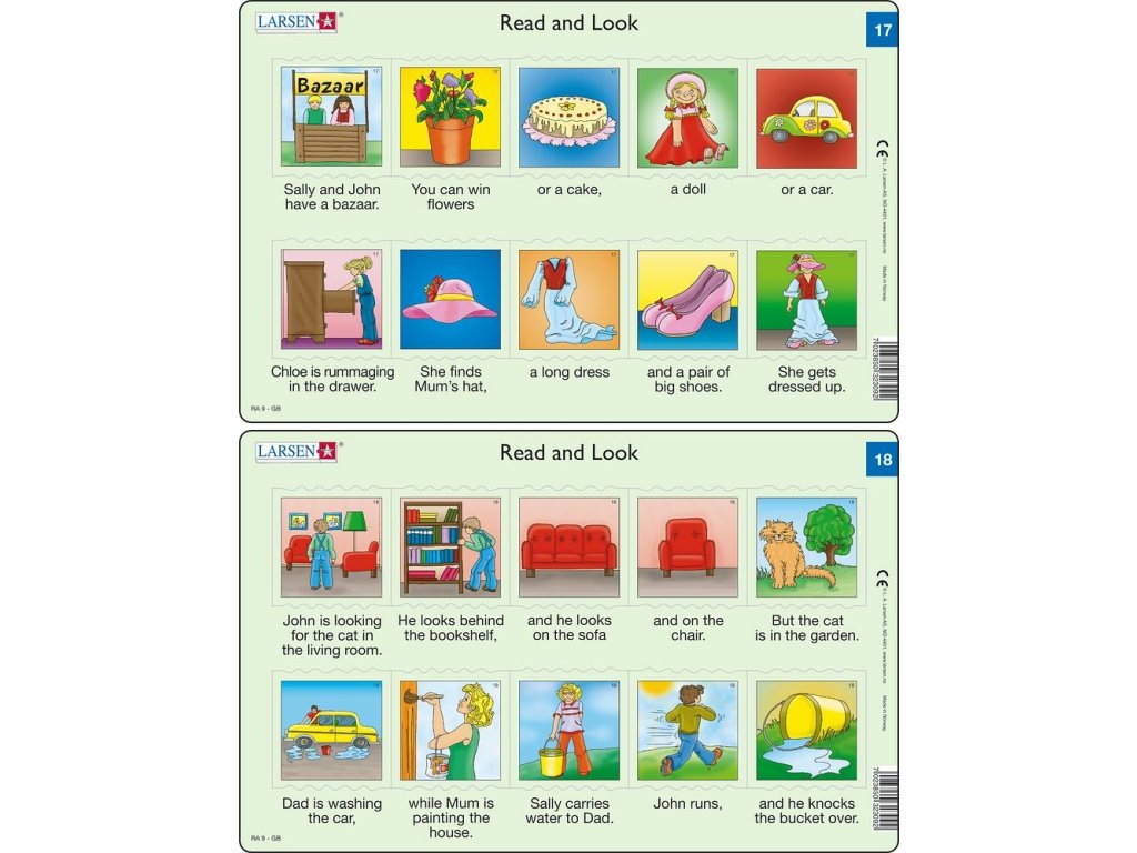 Puzzle Angličtina – krátký text RA9 obsahuje 10 dílků, každý s malým obrázkem. Pod každým dílkem se nachází text, který se vztahuje k příslušnému obrázku. Přečti text a najdi k tomu odpovídající obrázek. Každý dílek lze umístit pouze na přesně určené místo, což umožní dětem ověřit, zda správně spojily obrázek a text.