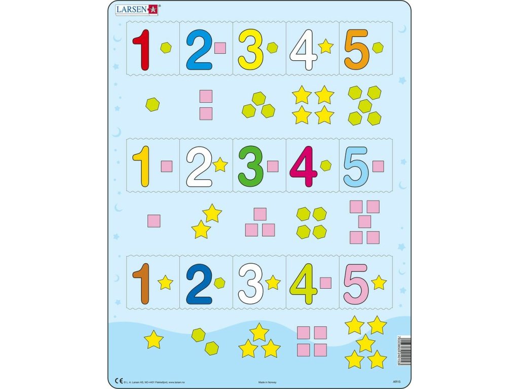 Puzzle Čísla 1–5 s grafickými znaky s 15 dílky. Výuková skládačka LARSEN poskytuje praktický trénink pro procvičování počítání do 5. Dítě se naučí, jak vypadá jednička, dvojka, trojka, čtyřka a pětka, a spočítá samo růžové čtverečky, žluté hvězdičky nebo zelené šestiúhelníky. Každý dílek má odlišný tvar a celé puzzle lze složit pouze tehdy, jsou-li všechny dílky správně umístěny.