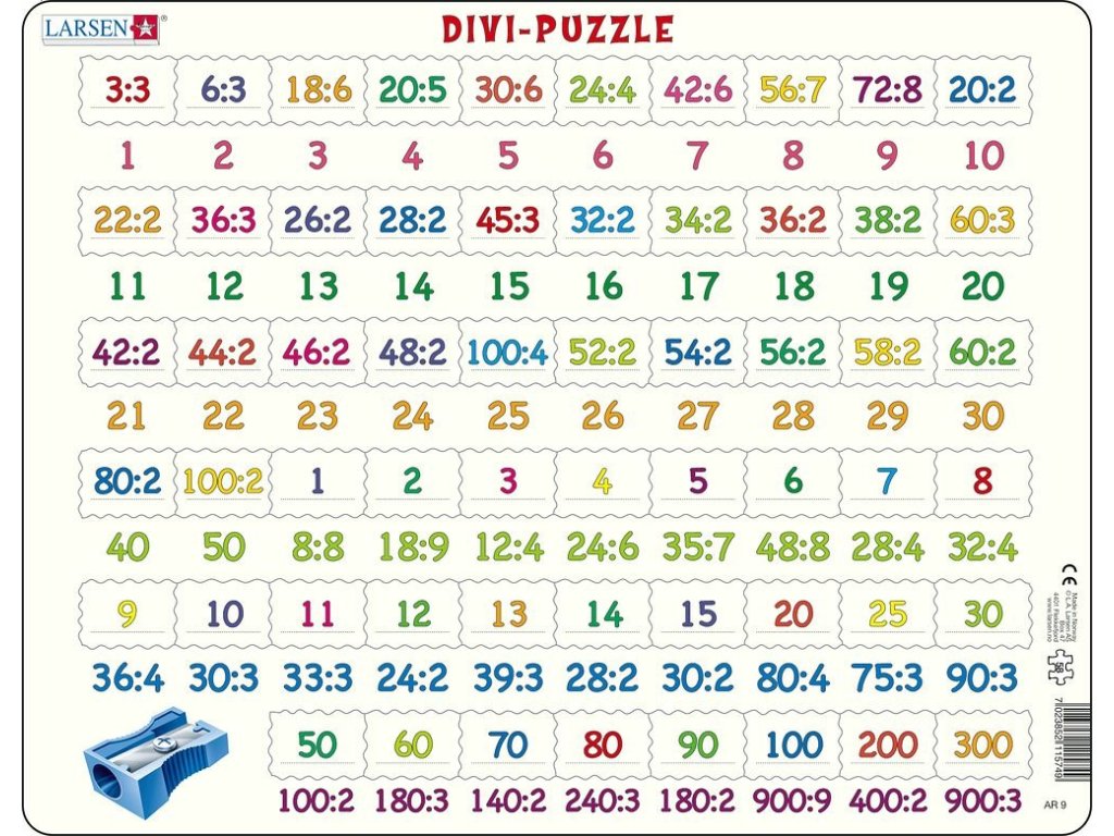 Puzzle Dělení 81 dílků pro začátečníky. Výuková skládačka LARSEN poskytuje praktický trénink pro procvičování dělení. Úkolem dítěte je nalezení dílku, který odpovídá danému matematickému zadání a dosahuje stejný výsledek. Každý dílek má odlišný tvar a celé puzzle lze složit pouze tehdy, jsou-li všechny dílky správně umístěny.