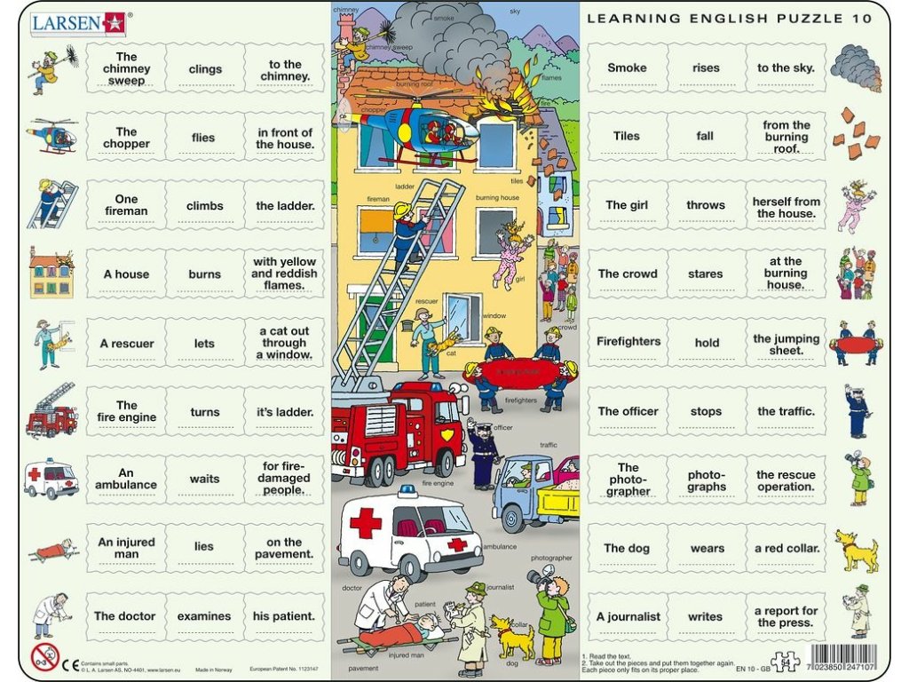 Puzzle Hodina angličtiny se 1064 dílky jsou výukové puzzle zaměřené na tvorbu jednoduchých vět. Obrázky zobrazují aktivity zvířat a lidí, poskytují zábavný prostor pro učení angličtiny. K jednotlivým obrázkům na okraji lze přiřadit dílky obsahující podmět (KDO) a přísudek (CO DĚLÁ?), čímž se utvářejí jednoduché věty. Uprostřed je zobrazena kompletní scéna s anglickým pojmenováním osob, zvířat nebo věcí. Každý dílek má unikátní tvar a celé puzzle lze složit pouze tehdy, jsou-li všechny dílky správně umístěny.