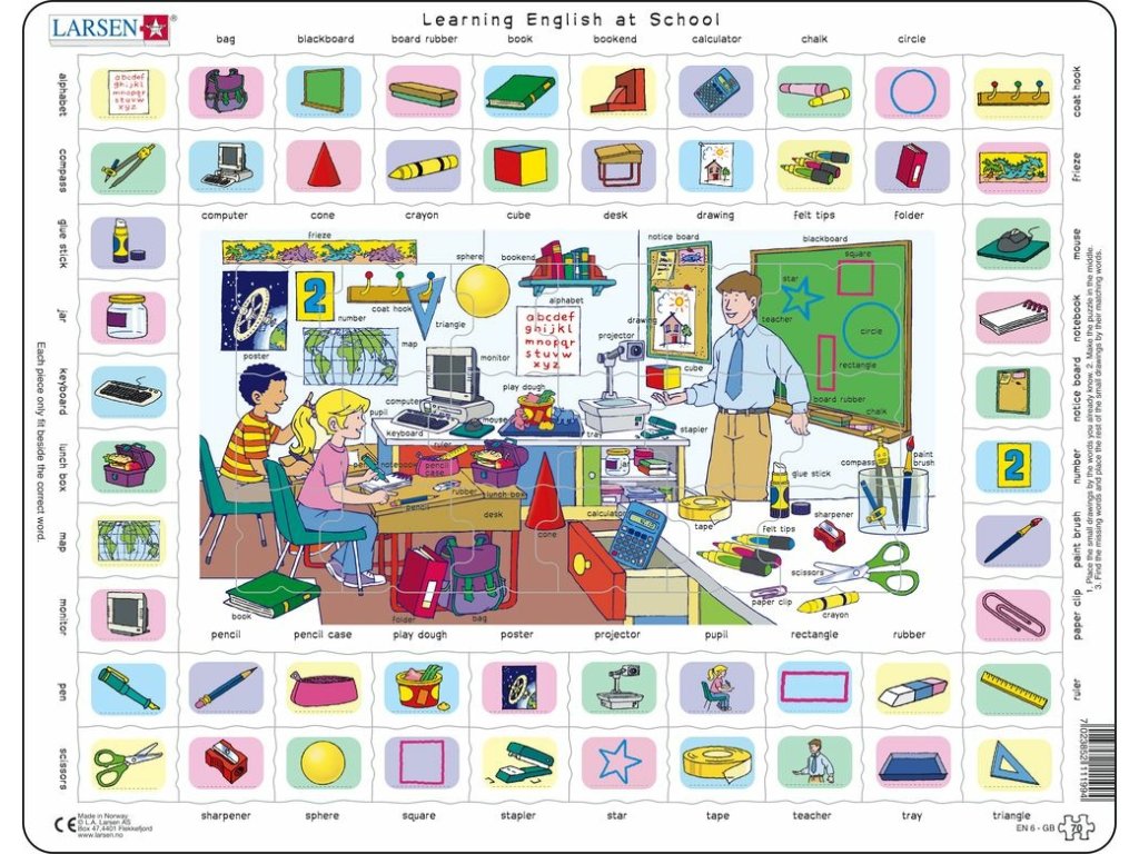 Naučte se 52 anglických slovíček s Puzzle Hodina angličtiny 670 dílků. Uprostřed je malé puzzle s 18 dílky a pevným rámečkem kolem dílků. V hádance je kresba kavárny a pro 52 věcí, které vidíte na kresbě, je 52 anglických slov. Na rámech venku najdete stejných 52 slov a ke každé z věcí je 52 kousků s obrázkem. Nejprve umístěte obrázky vedle anglických slov, která znáte. Pak dokončete hádanku uprostřed. Každý kousek se hodí pouze na své místo, i když vypadají stejně. Zapamatujete si nová slova, které jste se naučili.