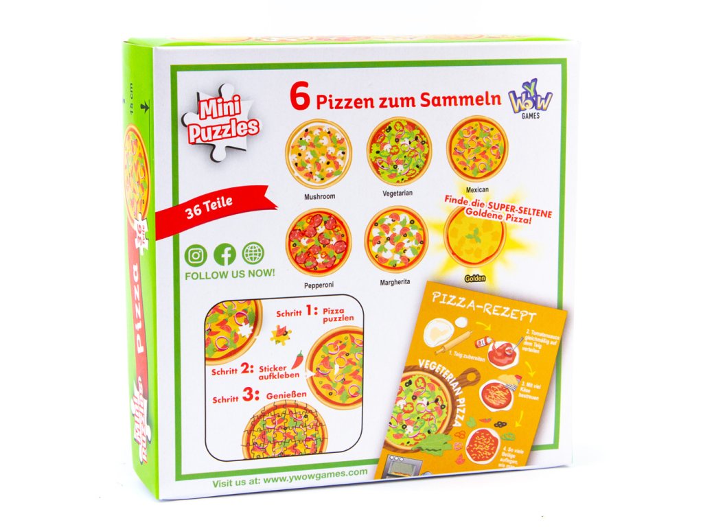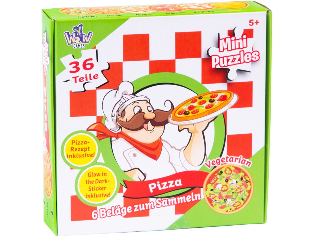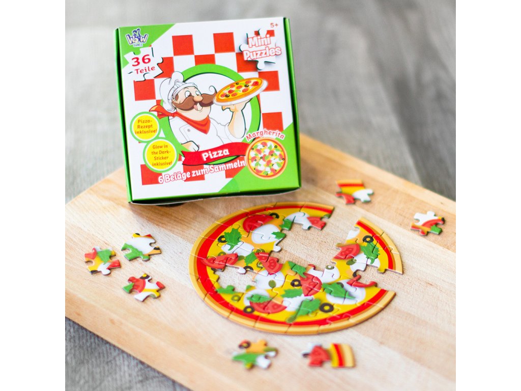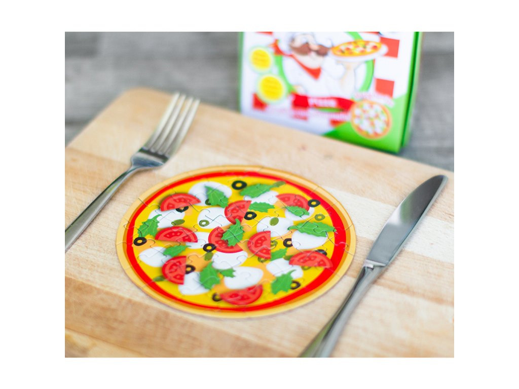 Puzzle mini Pizza 36 dílků. 6 různých druhů pizza – mexická, vegetariánská, margarita, feferonková, houbová a nejvzácnějí zlatá. Součástí balení je recept na pizzu a samolepka svítící ve tmě. Průměr obrázku 15 cm. Vyrobeno z ekologicky nezávadných materiálů.