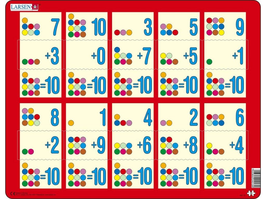Puzzle Sčítání do 10 II. s 10 dílky pro začátečníky. Výuková skládačka LARSEN poskytuje praktický trénink pro procvičování počítání do 10. Úkolem dítěte je nalezení dílku, který odpovídá danému matematickému zadání a dosahuje stejný výsledek. Každý dílek má odlišný tvar a celé puzzle lze složit pouze tehdy, jsou-li všechny dílky správně umístěny.