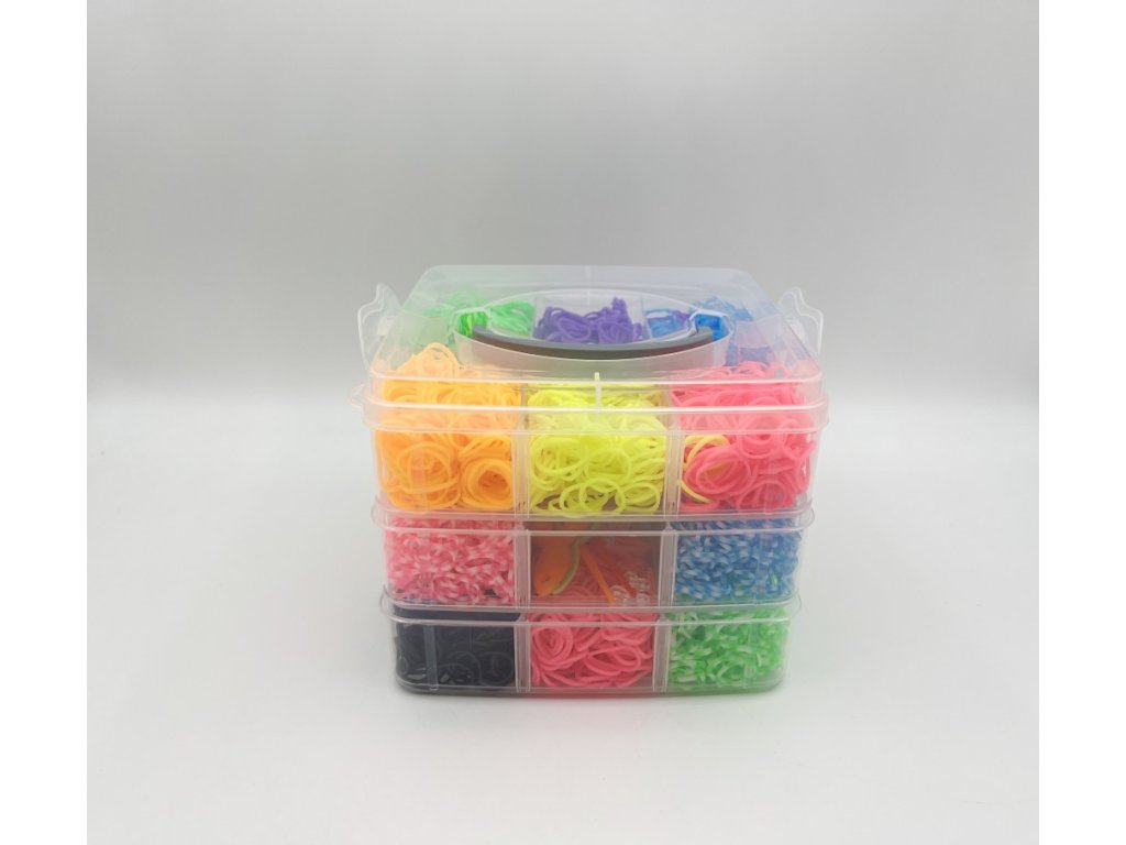 Sada gumiček Loom Band obsahuje celkem 3 000 kusů barevných pružných gumiček, které jsou rozděleny do tří průhledných plastových boxů s přehlednými přepážkami. Každý box je členěn na několik oddílů, což usnadňuje organizaci a výběr jednotlivých barev. Gumičky jsou v různých odstínech – najdete zde jasné neonové barvy jako žlutou, růžovou, oranžovou či zelenou, ale také jemnější pastelové tóny, dvoubarevné varianty a klasickou černou či bílou. Tento široký barevný výběr umožňuje vytvářet náramky a další ozdoby v různých barevných kombinacích a vzorech.