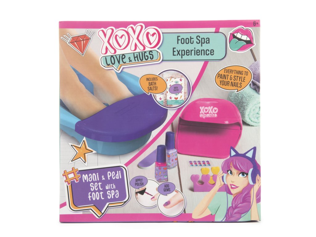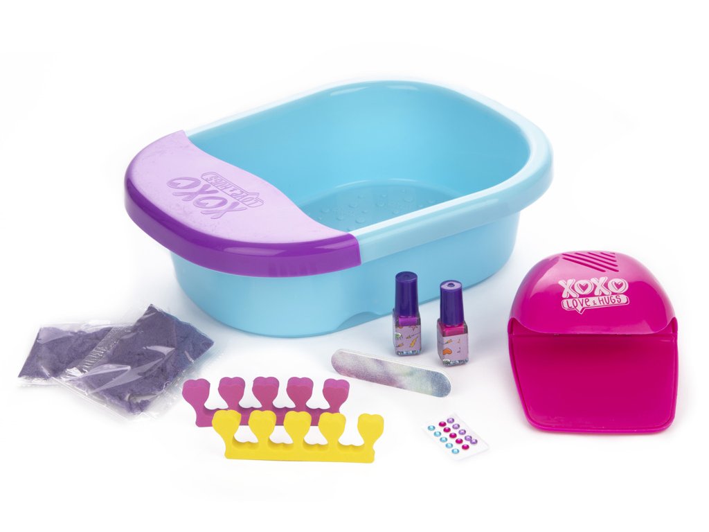 Sada na manikůru a pedikůru XOXO – sada obsahuje vaničku na nohy, 2× lak na nehty, 1× arch kamínků, zapékací lampa na nehty, 1× pilník, 2× pěnový oddělovač prstů, 2 pytlíčky šumivé soli.