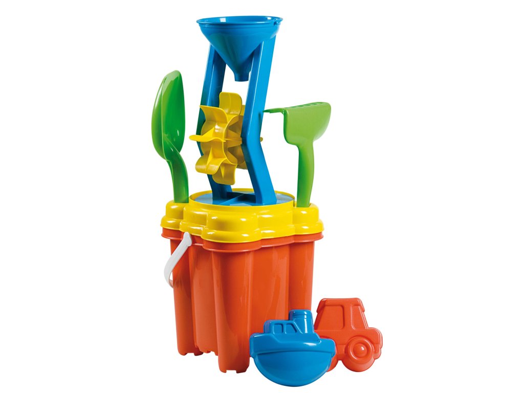 - Obsahuje: Kyblík, hrabičky, lopatičku, bábovičky a mlýnek.