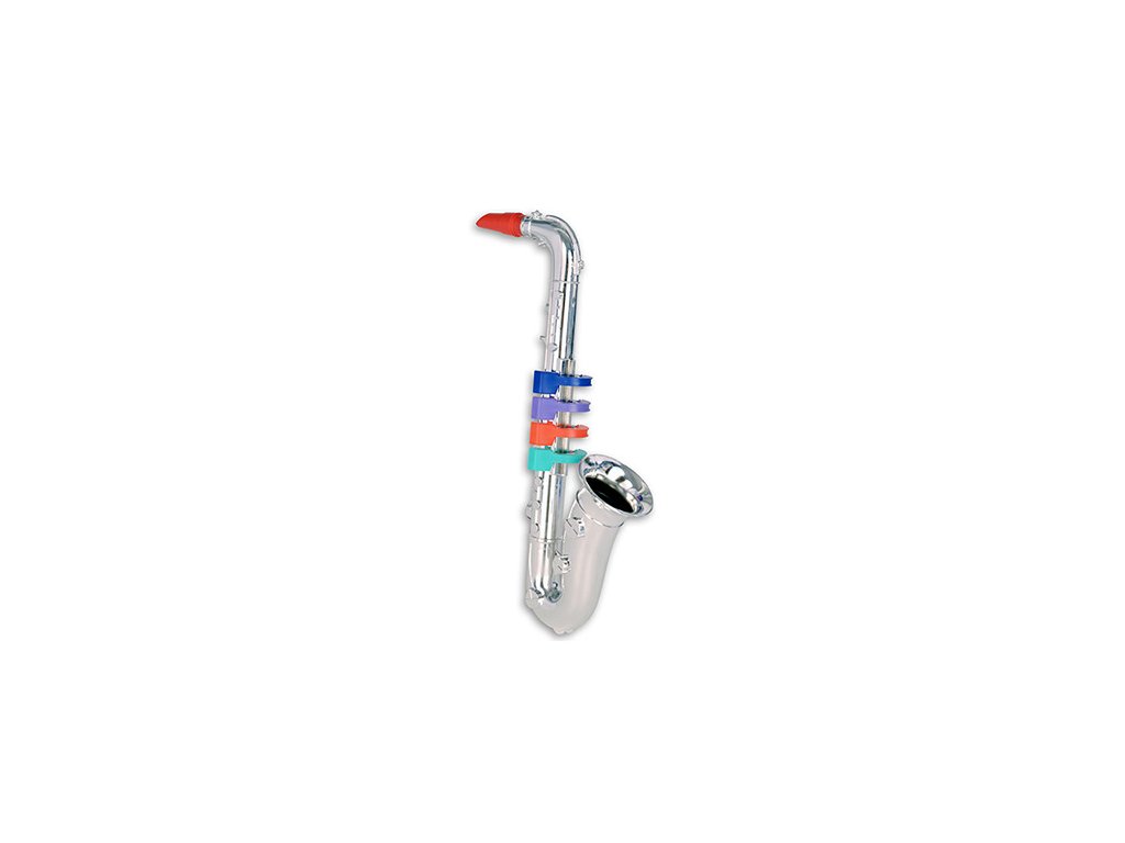 Saxofon plastový kovově lesklý se 4 klapkami. Vyrobeno v Itálii.