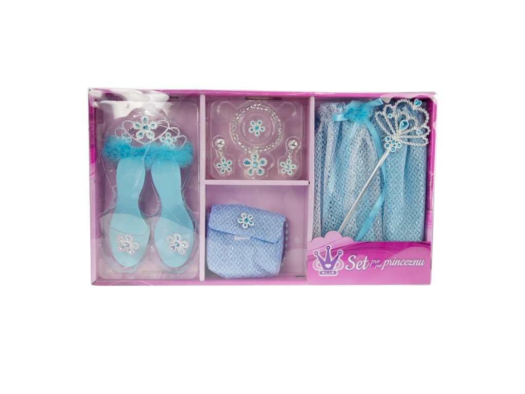 Každá holčička by chtěla být princeznou. Bav se s tímto princeznovským setem a ukaž jaká jsi princezna. Sada obsahuje sukýnku, pantoflíčky, korunku, kabelku, hůlku a šperky v modré barvě.