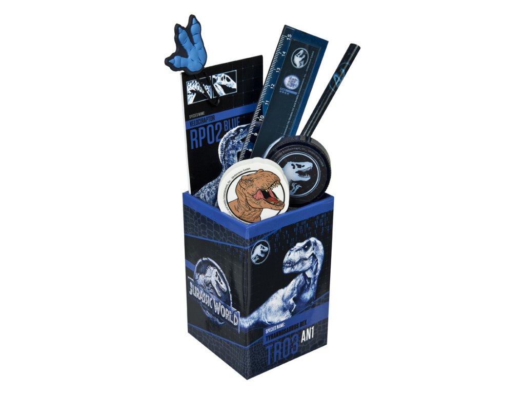 Kelímek se školními potřebami – obsahuje tužku, gumu, ořezávátko, pravítko, mini notýsek, velký papírový, tvarovaný klip.