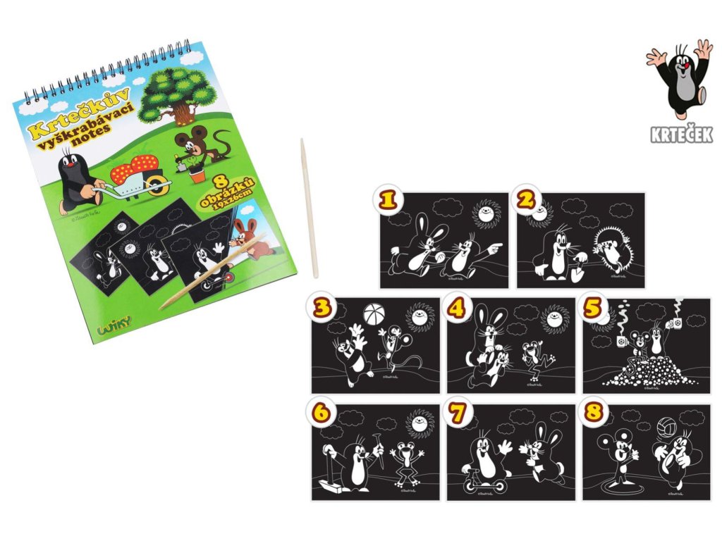 Dopřejte si chvilku odpočinku a kreativně se vydovádějte na vyškrabovacím notesu se zábavným motivem krtečka. Na jednotlivých 8 listech, můžete pomocí vyškrabovacího pera vytvářet různé pestrobarevné obrázky dle předlohy.