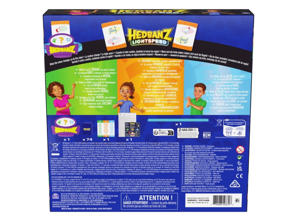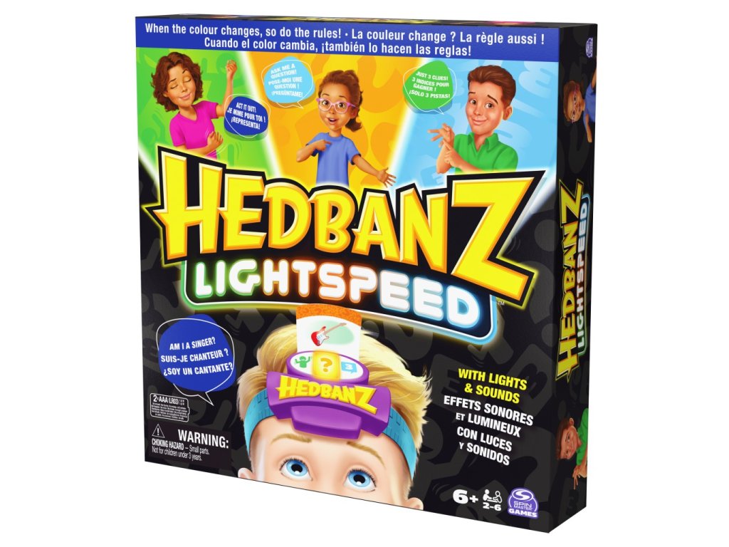Rychlá hádací hra „Co jsem?“ je zpátky z Hedbanz Lightspeed! Hedbanz od Spin Master Games je zábava pro celou rodinu. Hraje oblíbenou hru s otázkami rychlostí světla! Pravidla se mění bleskově, protože vaše elektronická čelenka přepíná mezi třemi barvami. Uhodněte maximum karet, než z čelenky začne hrát hudba, která znamená, že váš čas vypršel! Hráč, který nasbíral nejvíc bodů, vyhrává! Když svítí ZELENÁ, hrajete scénku! ORANŽOVÁ znamená rychlost světla: odpovídejte co nejrychleji! Když uvidíte MODROU, je čas na tři nápovědy! Tuto jedinečnou elektronickou čelenku si zamilujete. Protože má SVĚTLA a ZVUKY, vyžaduje 2 baterie AAA (nejsou součástí balení). Na kartách jsou vtipné ilustrace, jako třeba kyselá okurka nebo elektrická kytara. Hedbanz je nezbytným doplňkem vaší sbírky deskových her pro děti ve věku 8–12 let, ale pobaví každého od 6 let výš. Je vhodná pro 2–6 hráčů a poslouží vždy, když budete potřebovat hračky pro dívky ve věku 6–8 let, rodinné deskové hry nebo hry pro děti. Hedbanz je společenská aktivita pro celou rodinu, která pobaví všechny generace. Je to klasická hra s hádáním obrázků, která je známá už roky! Ať už hledáte deskové hry pro děti ve věku 6–8 let nebo jakékoliv zábavné hry, tato nová edice Hedbanz vás jednoznačně pobaví – když se změní barva, mění se i pravidla! Připravte se na světla, barvy a akci s Hedbanz Lightspeed! Spin Master přináší dětem zábavu v podobě hraček a her včetně hraček pro batolata, hraček pro dívky a deskových her. Sbírejte své oblíbené plyšáky, antistresové hračky, auta na dálkové ovládání, akční figurky, panenky a příslušenství a mnoho dalšího. V našem katalogu najdete ideální dárek ke každým narozeninám, od speciálních dárků pro děti a batolata až po dárky pro ty, kteří zůstávají mladí duchem. Pokud chcete ještě víc, podívejte se na vzdělávací hračky pro děti, hračky do bazénu, venkovní hry a monster trucky vhodné pro každé roční období. Buďte kreativní s výtvarnými sadami, stavebnicovými hračkami a autíčky na dálkové ovládání nebo skládejte skládačky pro dospělé a hrajte karetní hry. Roztočte to na pískovišti ještě dnes se Spin Masterem!