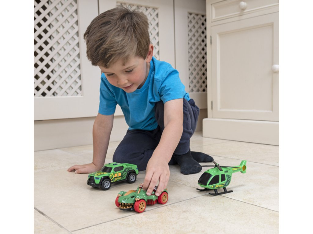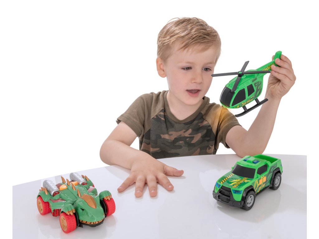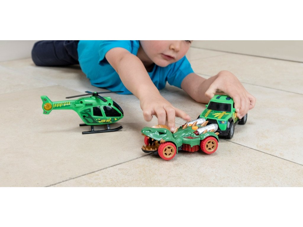 Kromě monster auta součástí balení je i helikoptéra Dino Hunt s ručně otáčejícími se listy vrtule, která je perfektní pro náročné letecké honby. Dino Hunt pick-up je vybaven nouzovými sirénami a světly, což přidává další prvek realismu při záchranných misích.